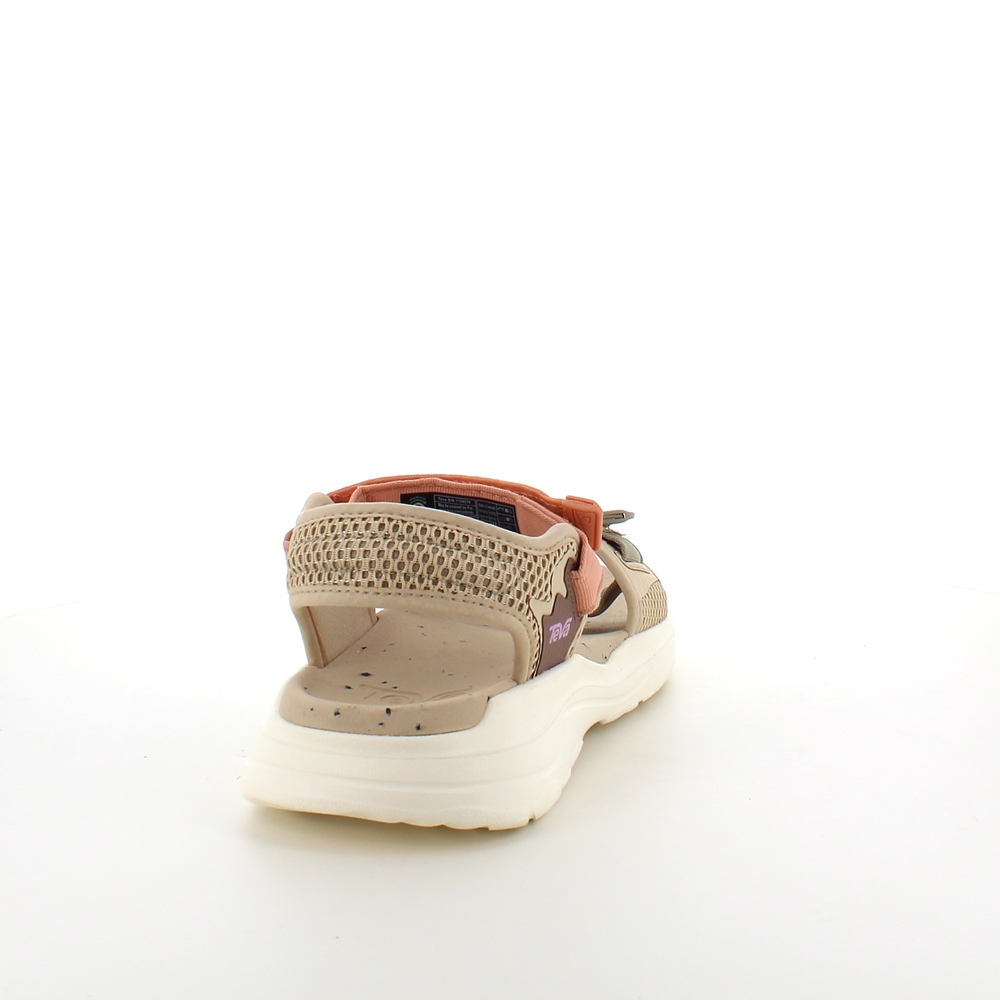 Beige sandal fra Teva med fargede polyesterrammer der hælremmen og det nederste ved forfoten er foret