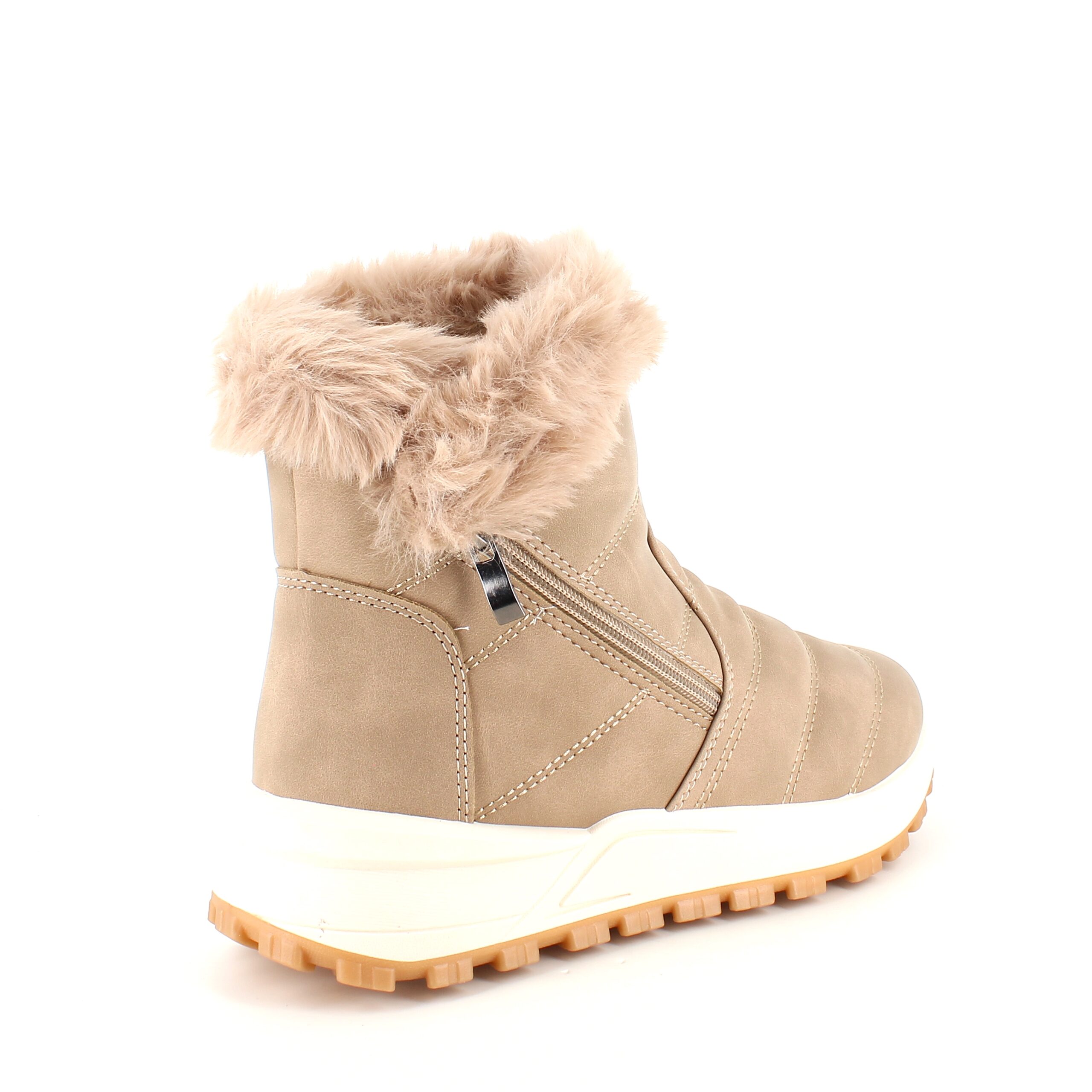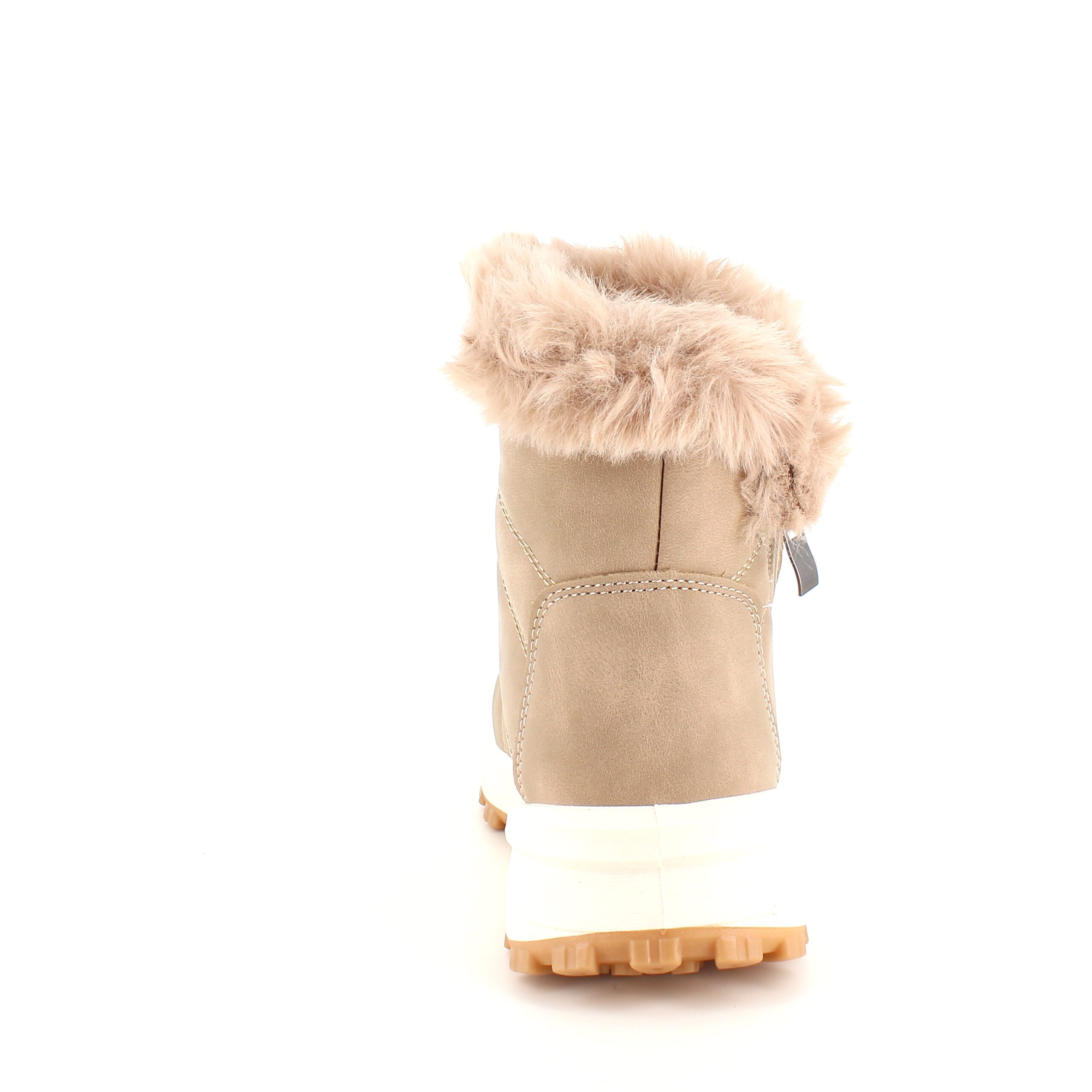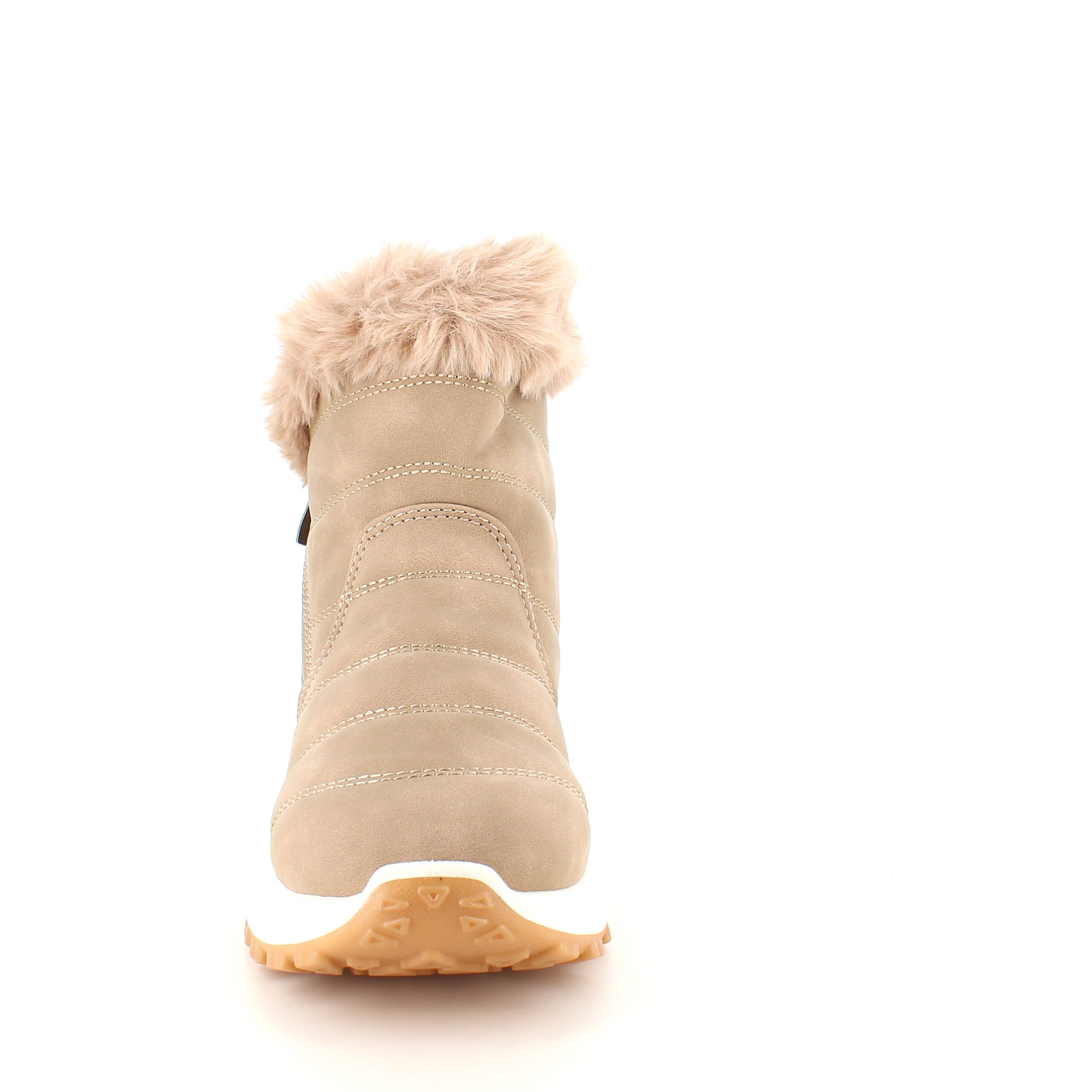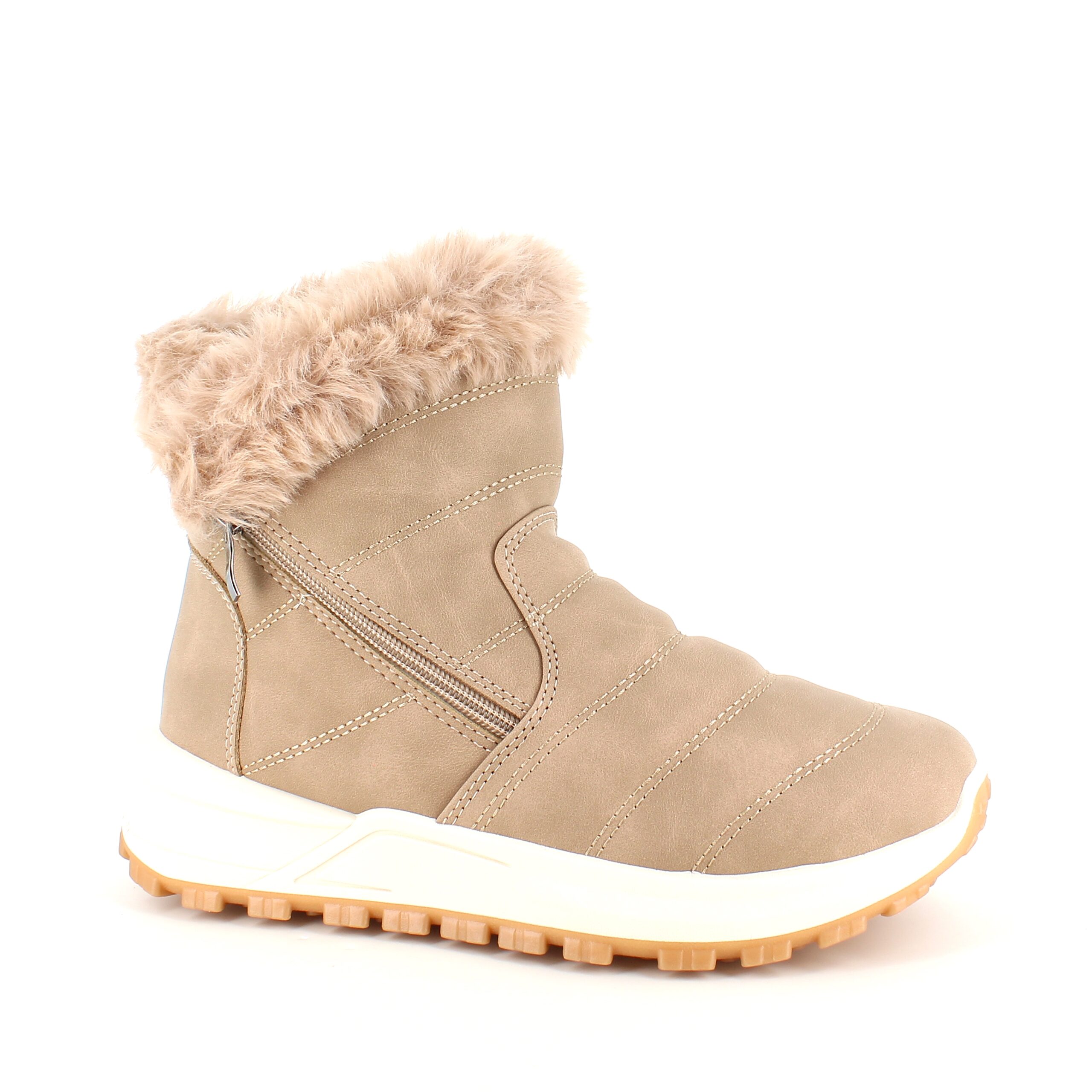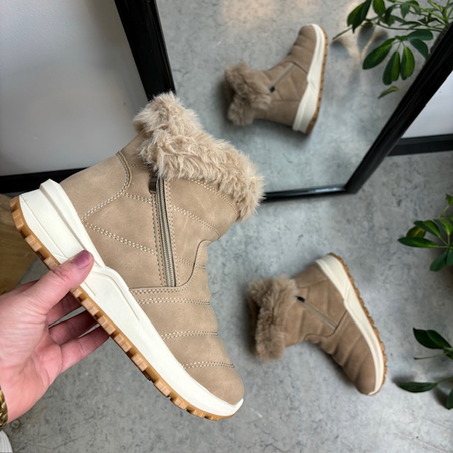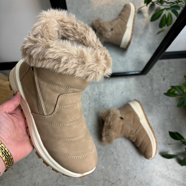 Beige vinterstøvel med mykt fôr og støtdemping har smarte detaljer på overdelen og en synlig pelskant øverst på skaftet.