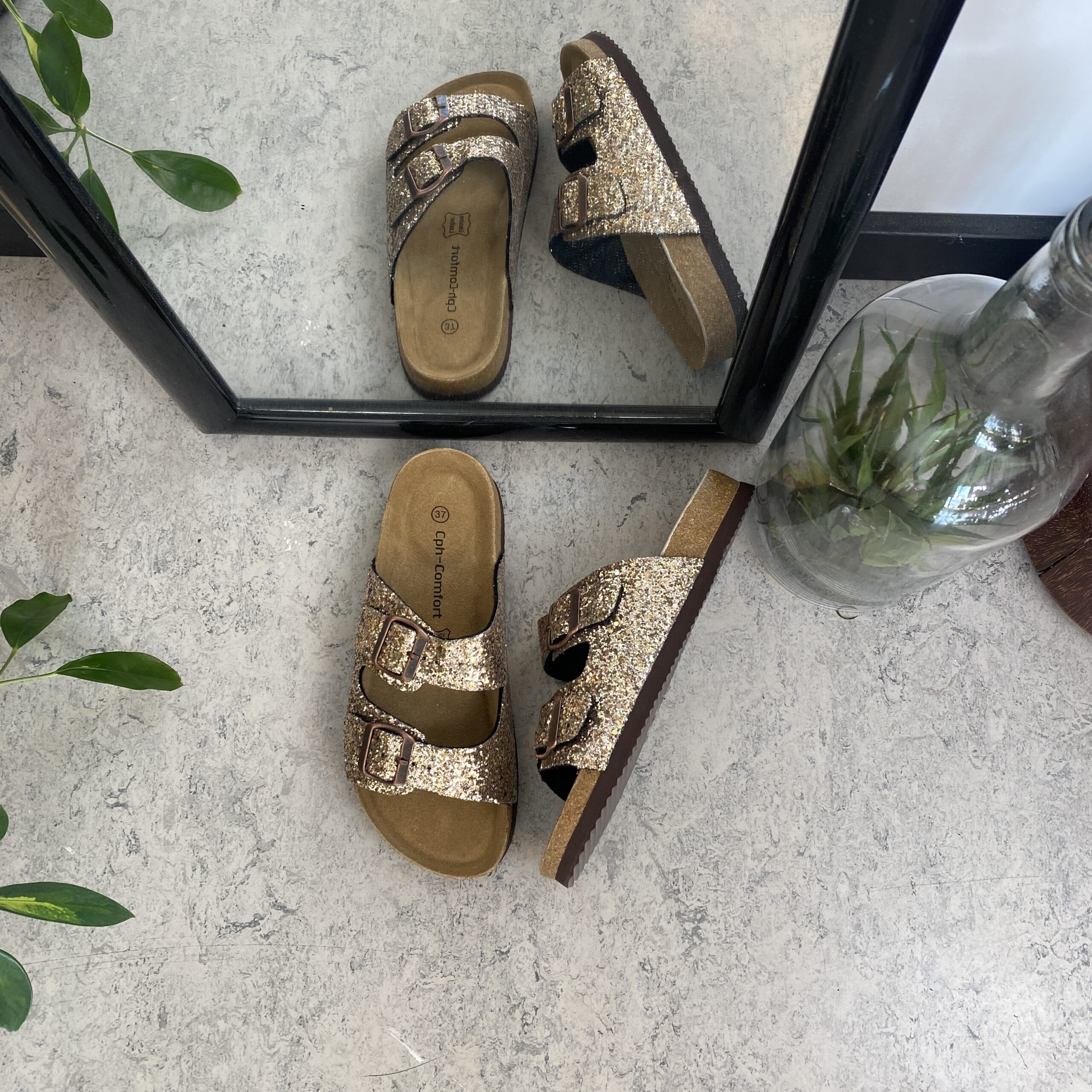 De gode, brede remmene kan lett justeres og er pyntet med elegant gullglimmer som gir et stilfullt preg.