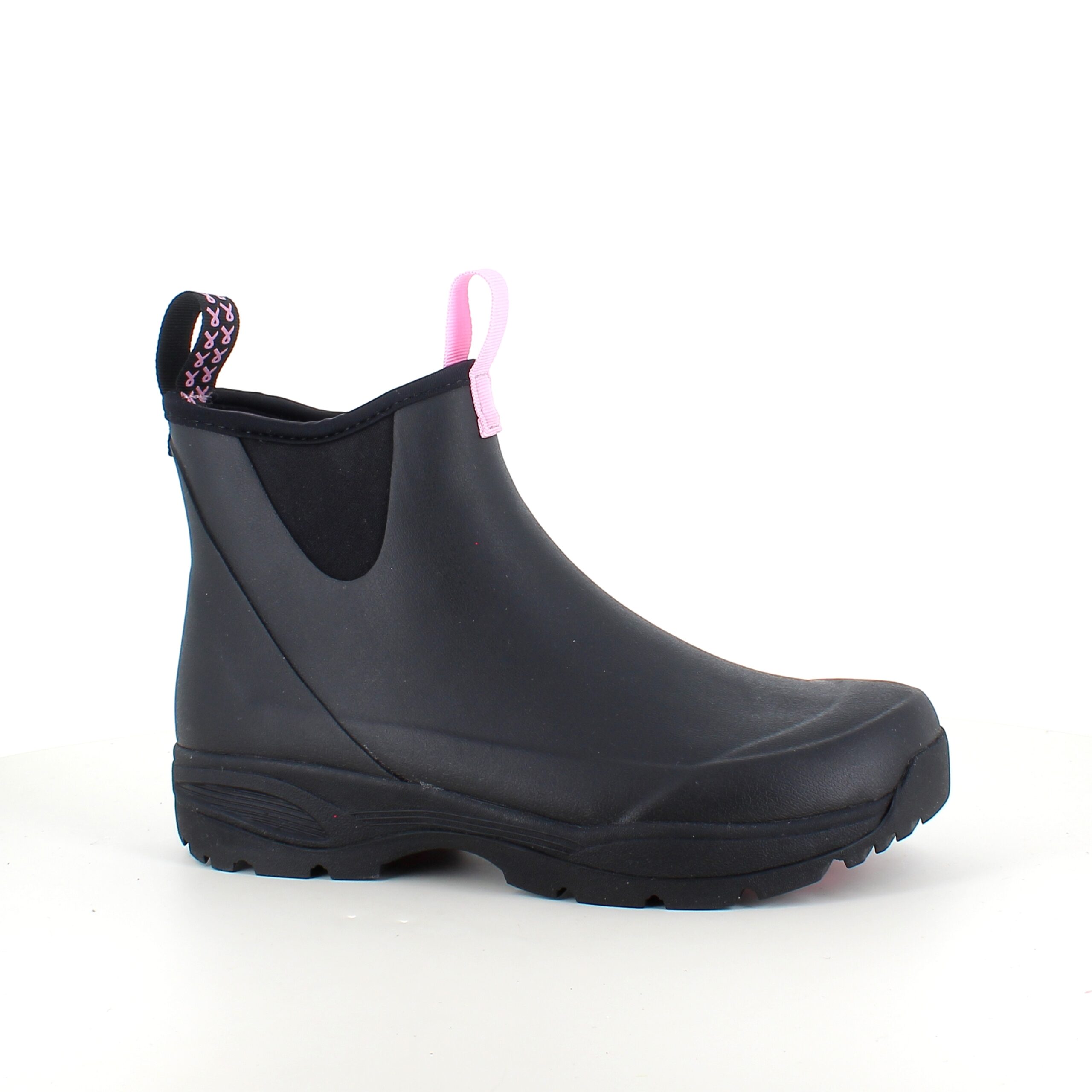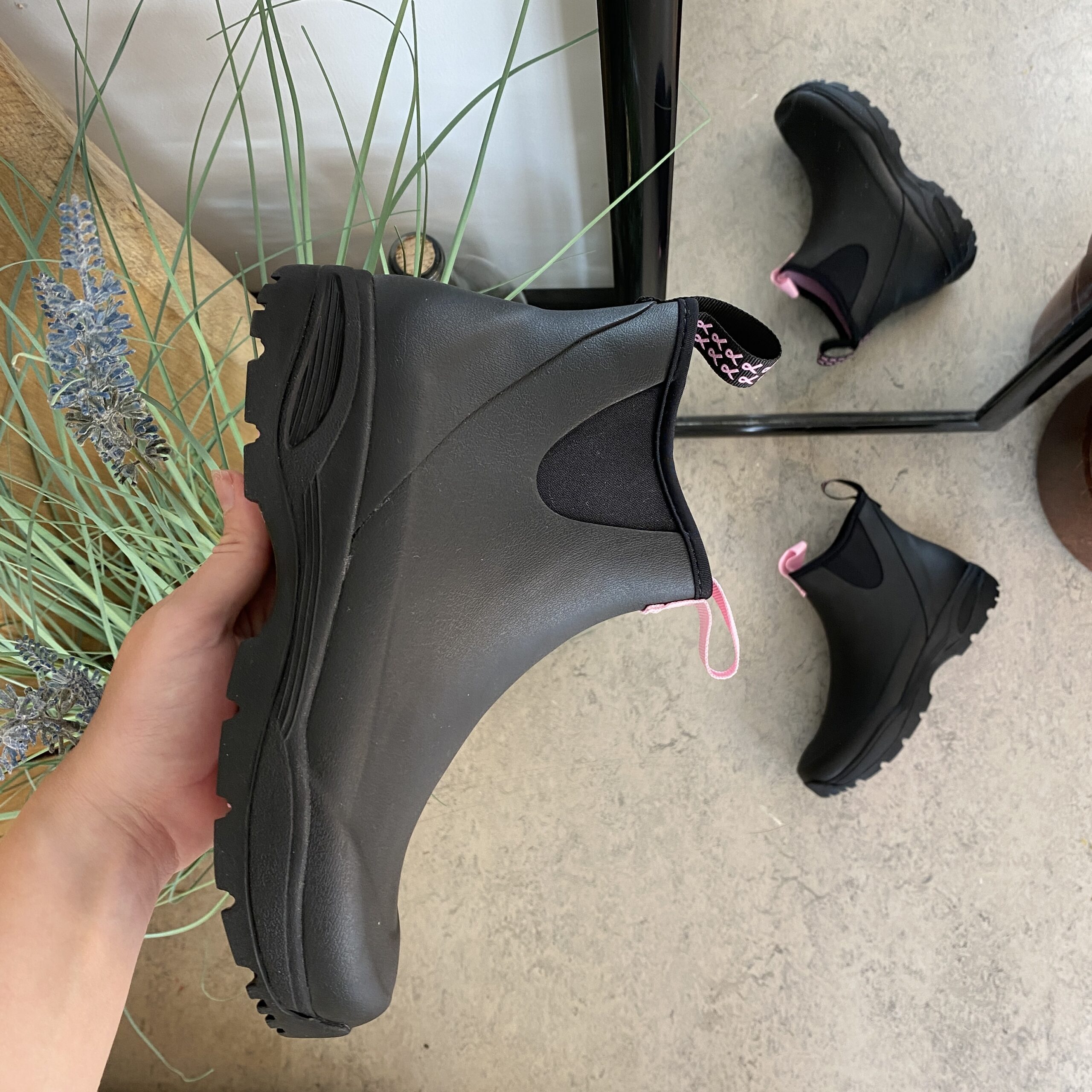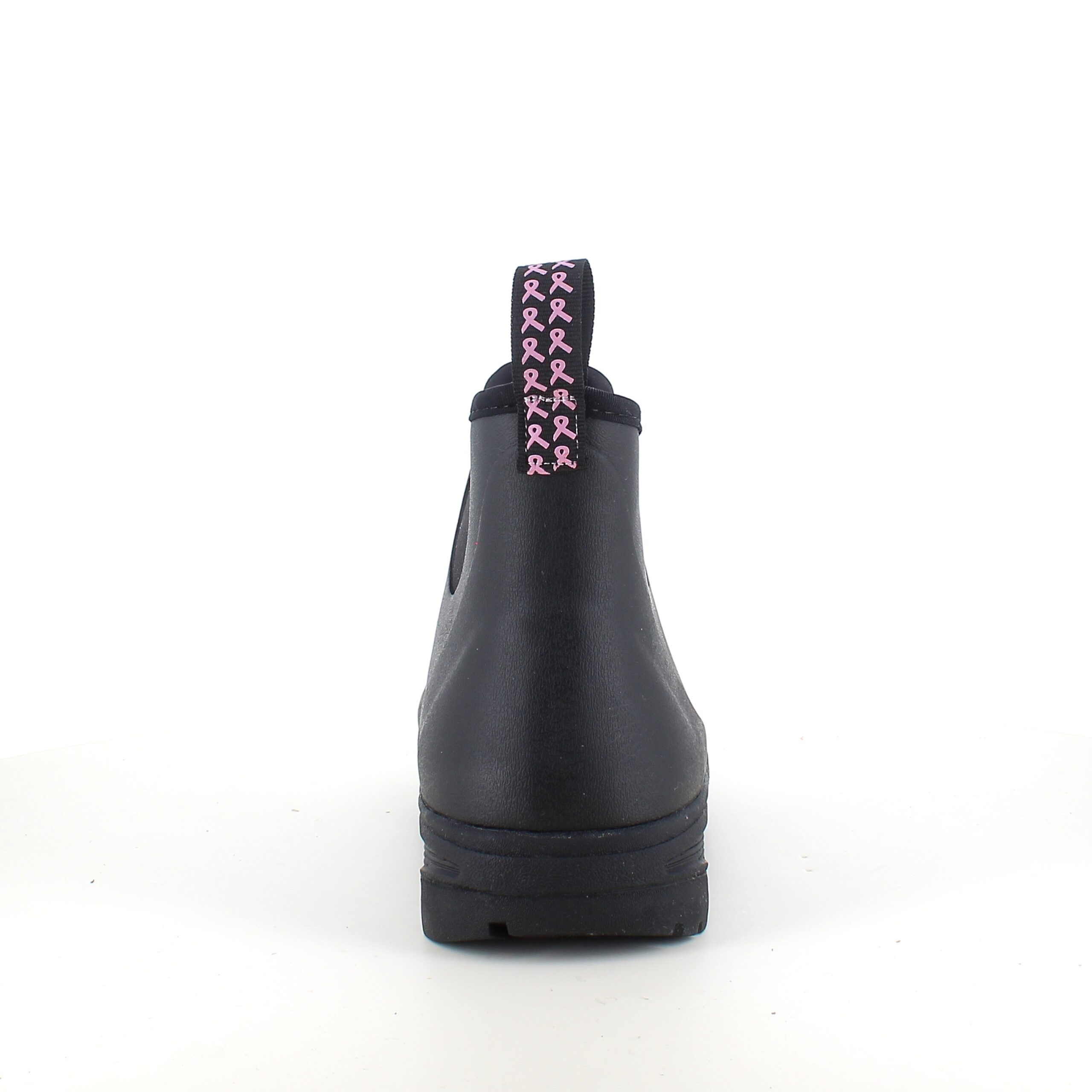 Opplev våre svarte gummistøvler, skapt med omtanke og i samarbeid med Støt Brysterne, hvor den gjenkjennelige rosa fargen elegant fremheves i bunnen av støvelen samt i den dekorative sløyfen, som pryder den ene stroppen.
