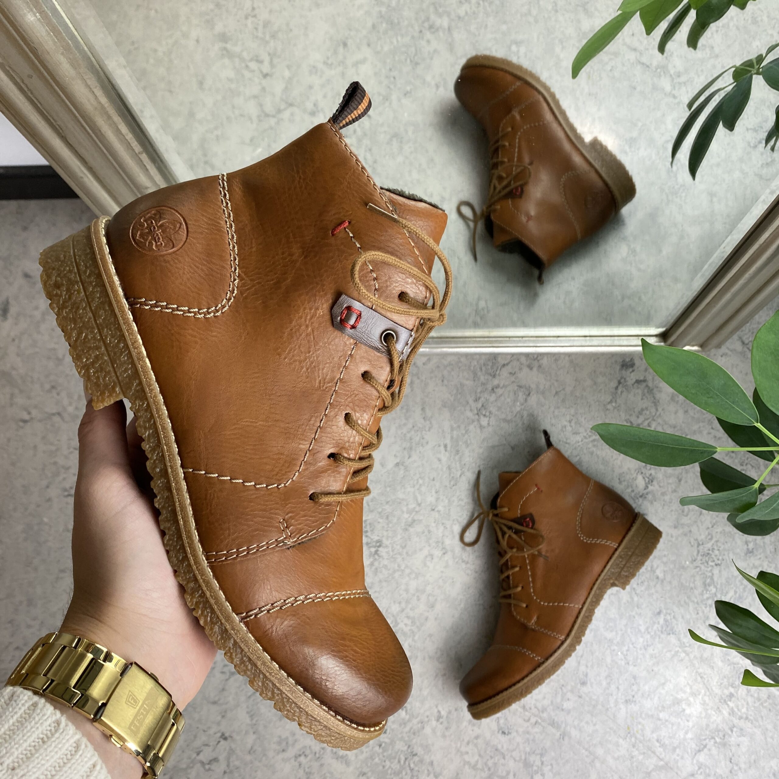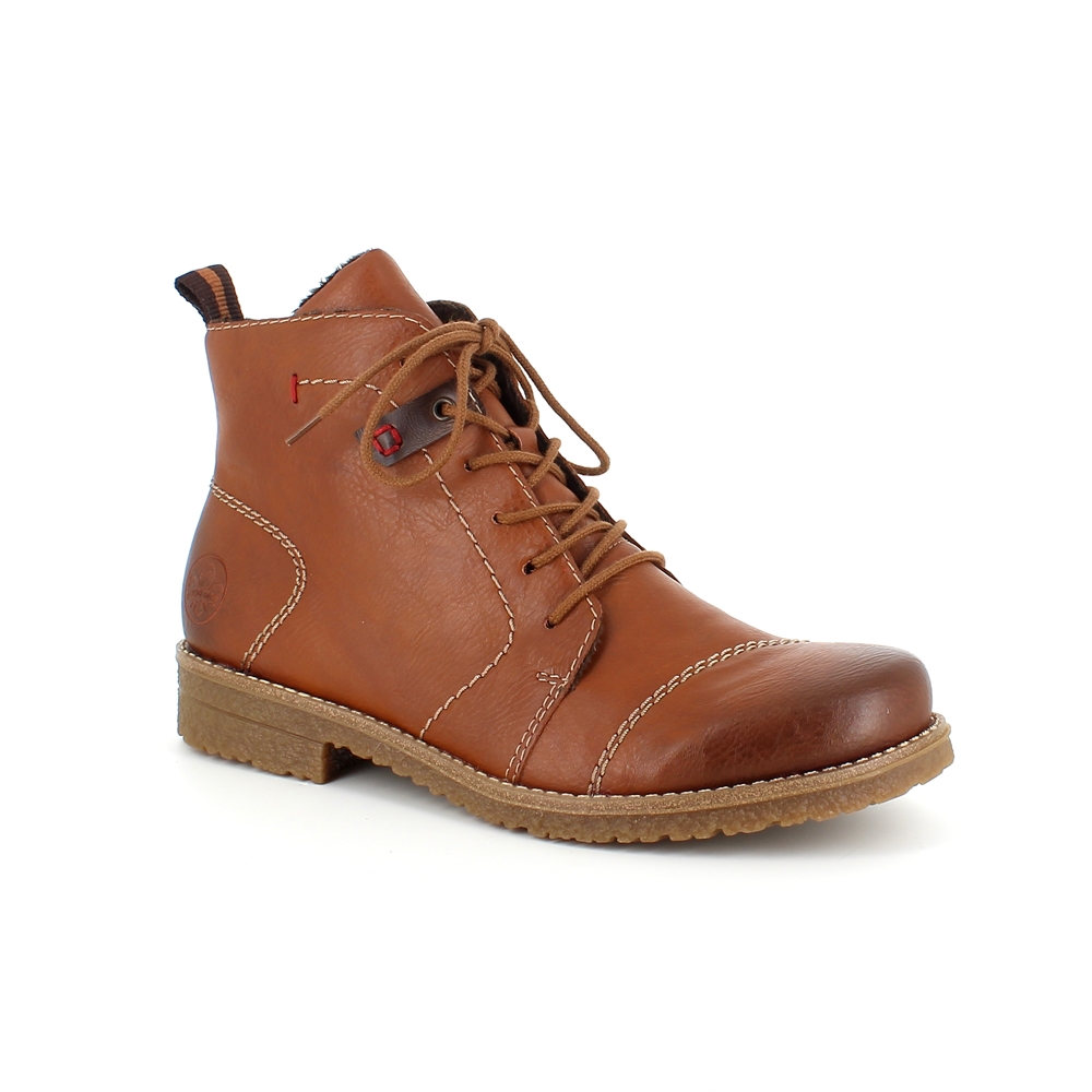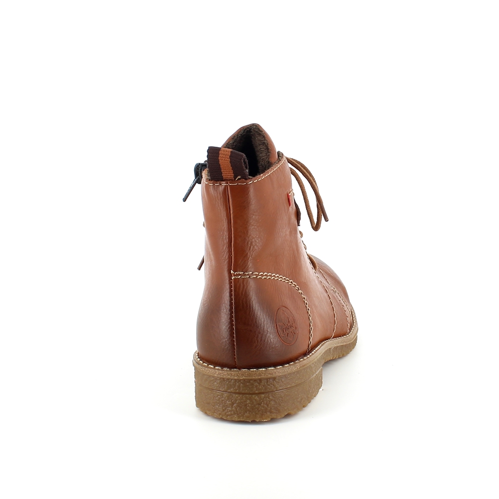 Klassisk brun Rieker støvel med glatt overflate og detaljer med synlige sømmer