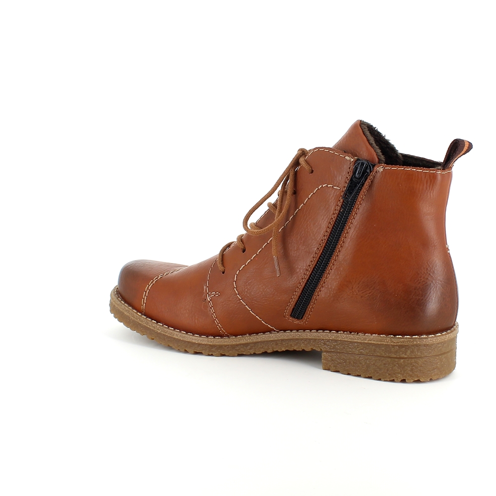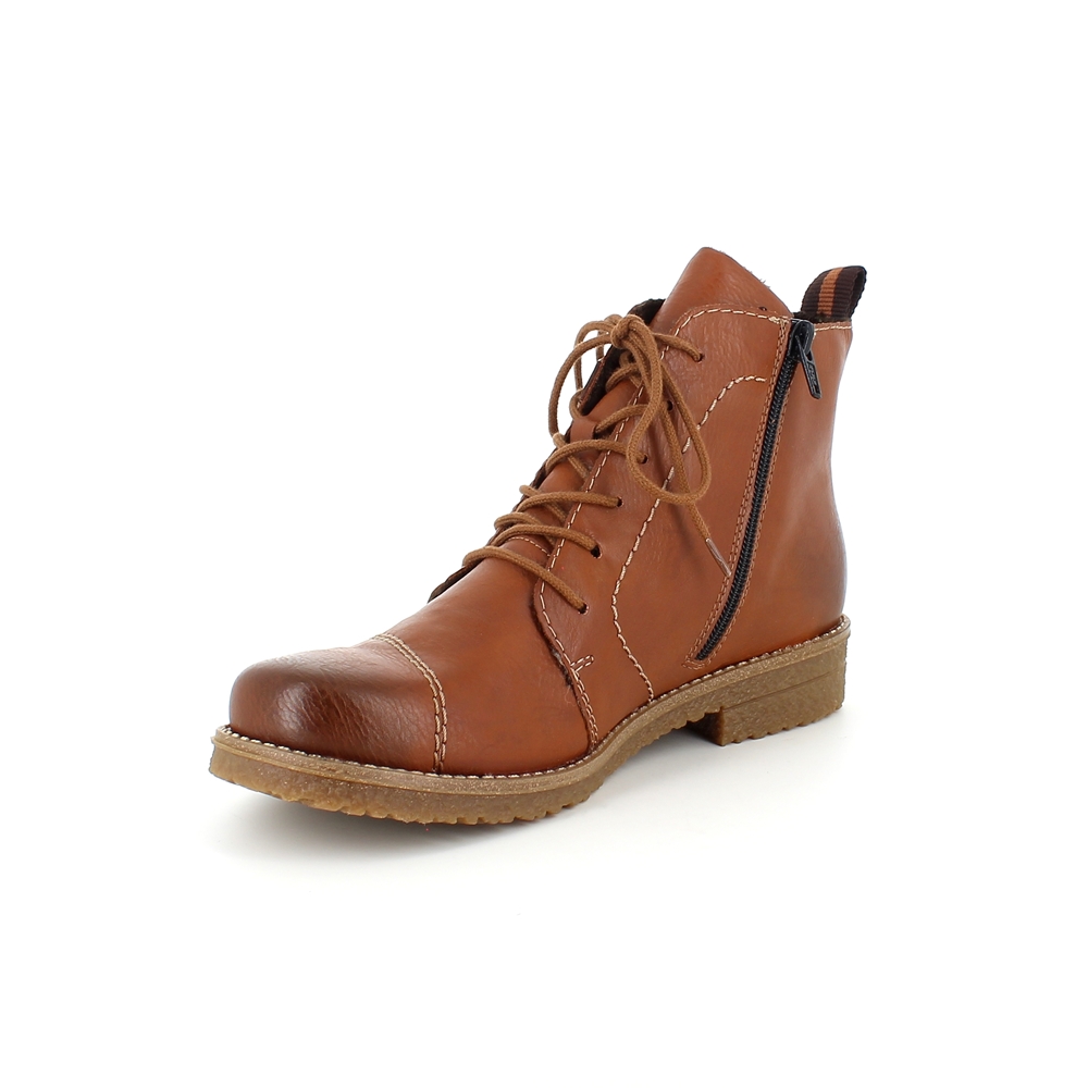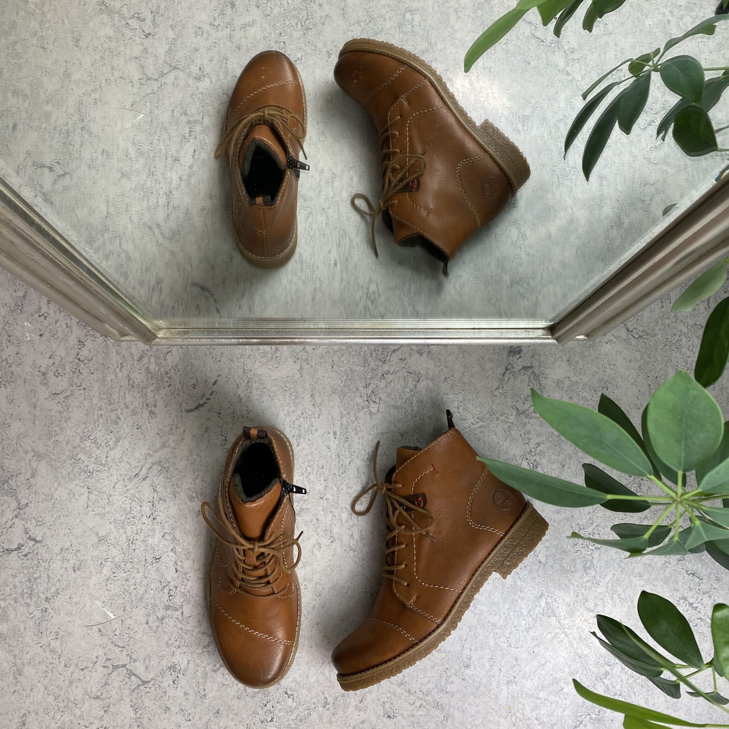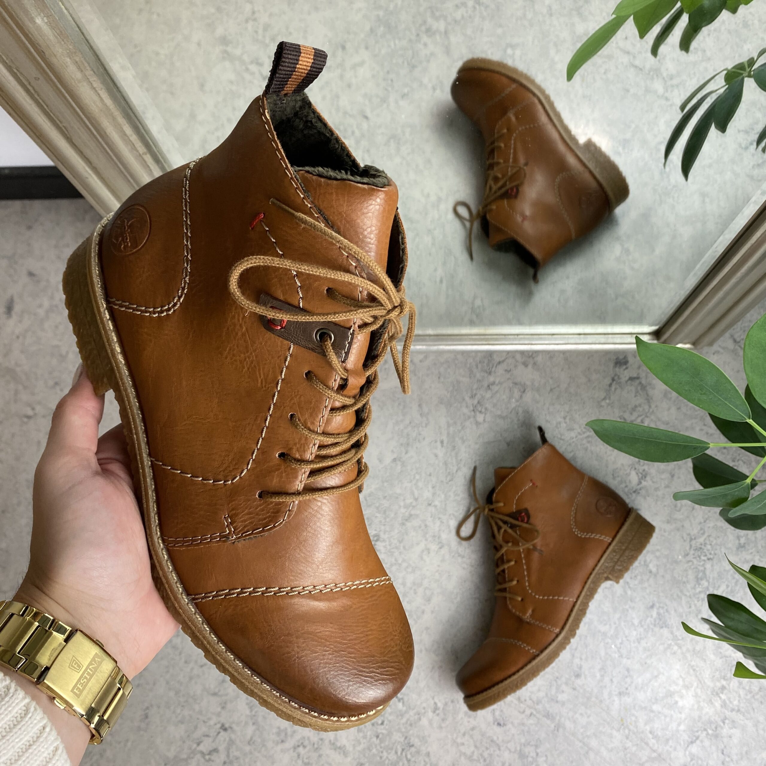 Klassisk brun Rieker støvel med glatt overflate og detaljer med synlige sømmer