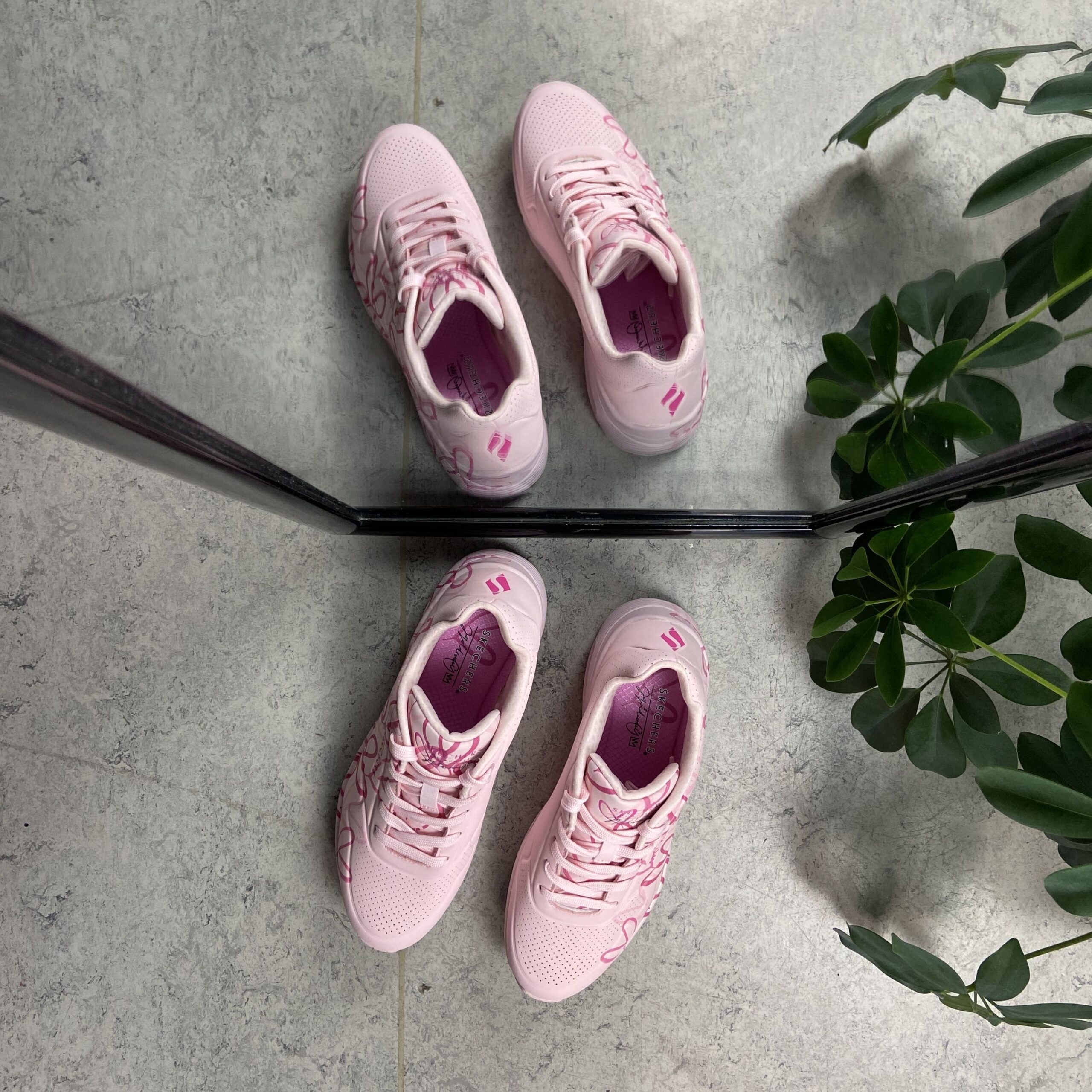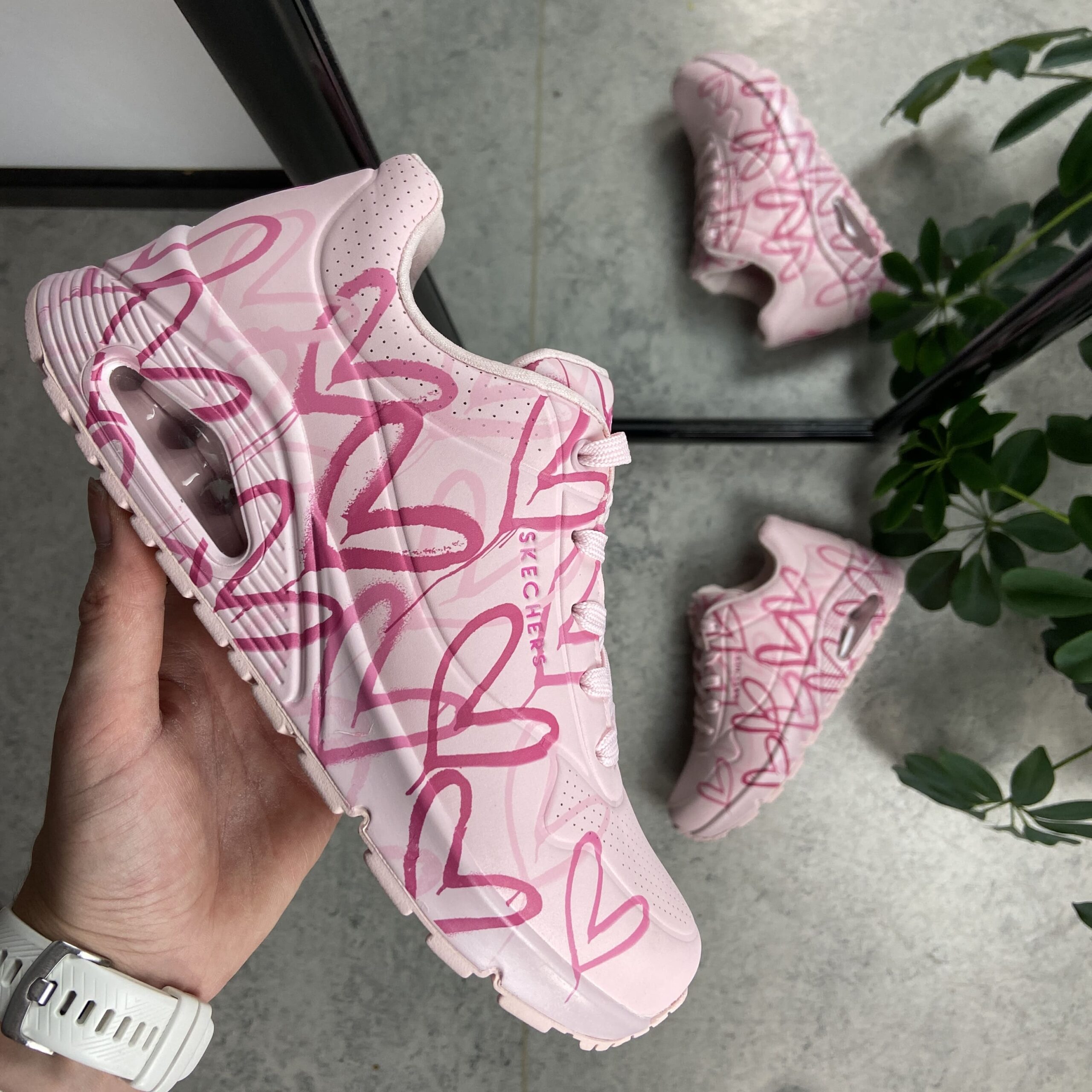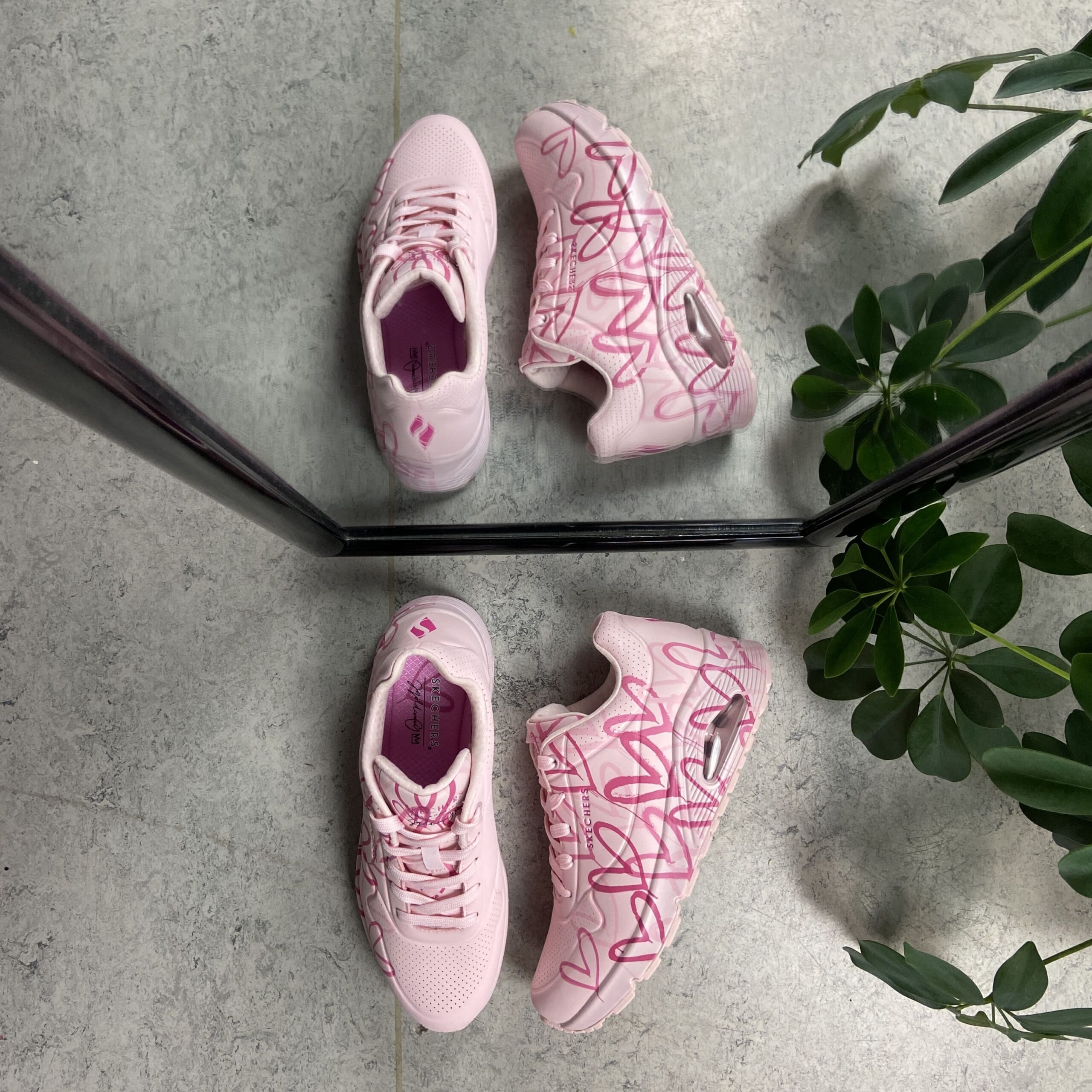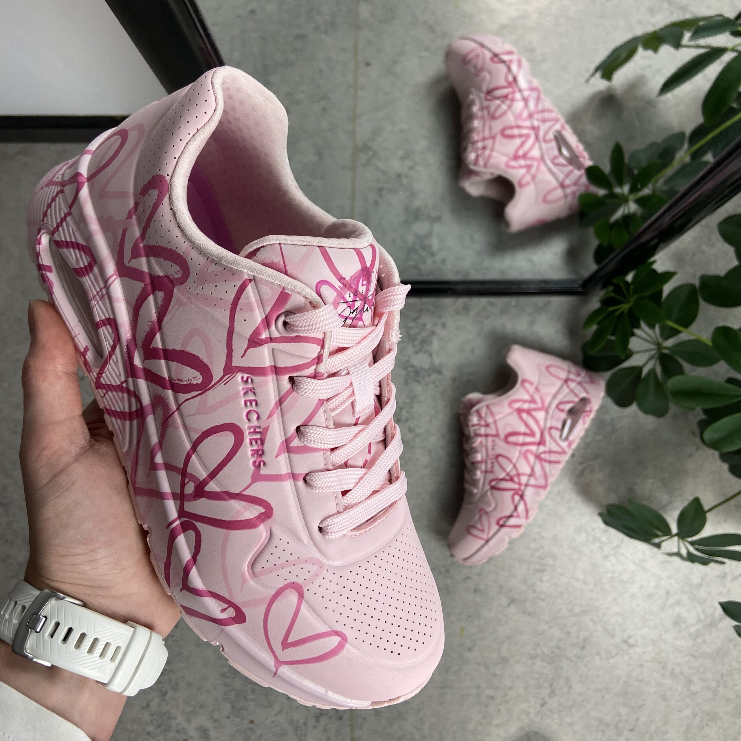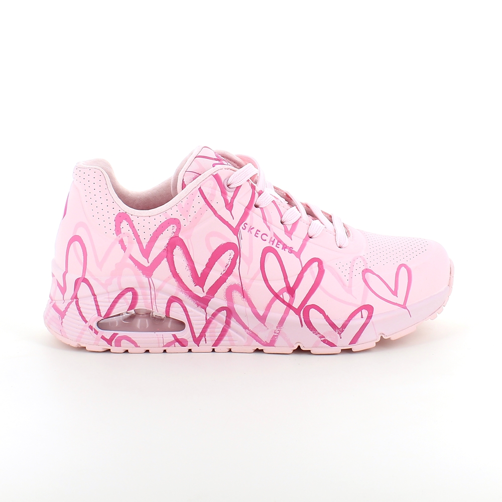 Rosa Skechers med de kuleste hjertedetaljer med de ikoniske Lovewall-hjertedesignene av kunstneren James Goldcrown.