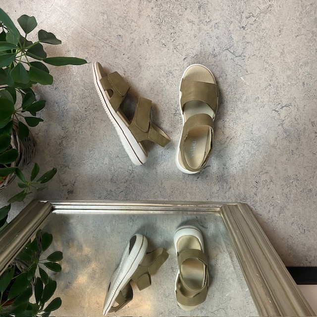 Smart sandal i olivengrønn glatt kalveskinn.