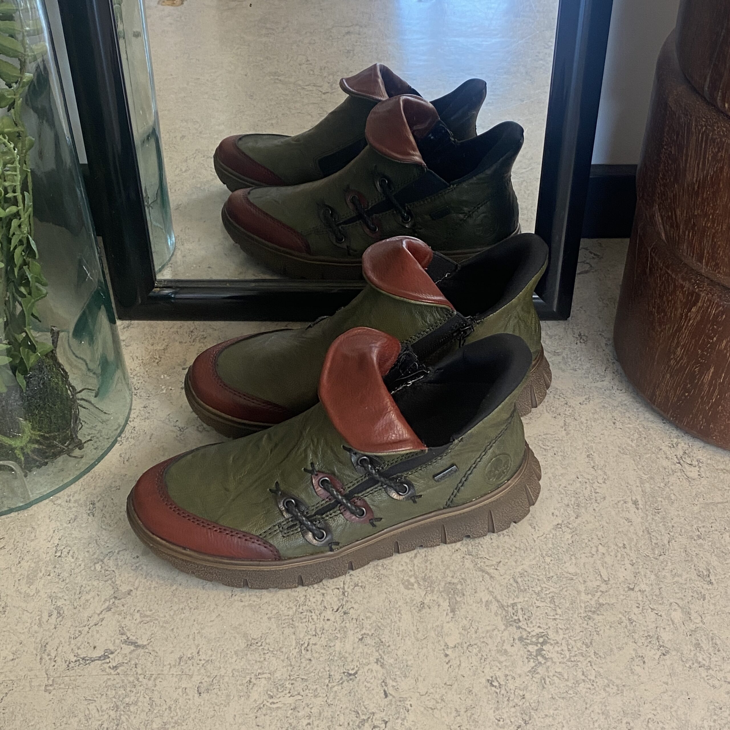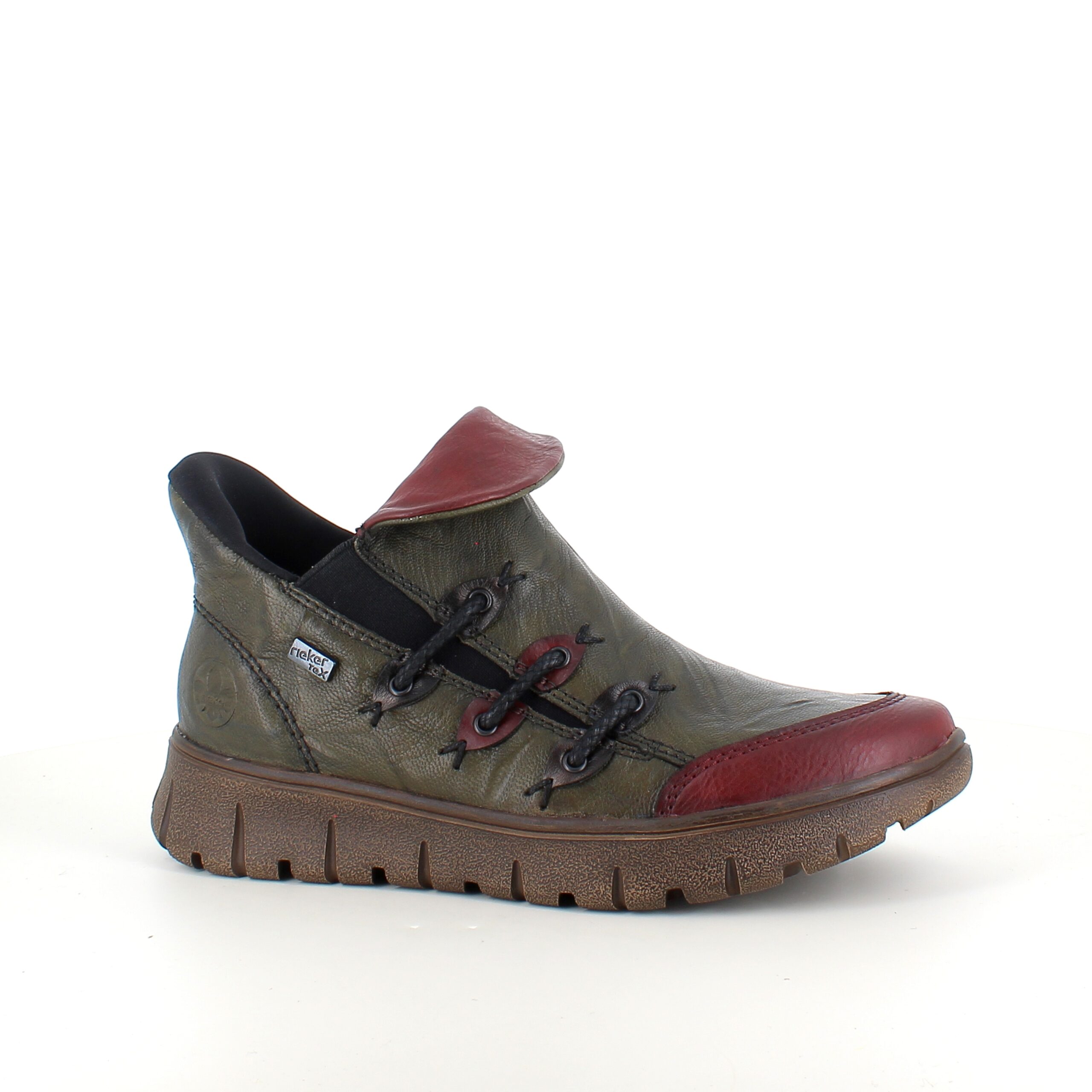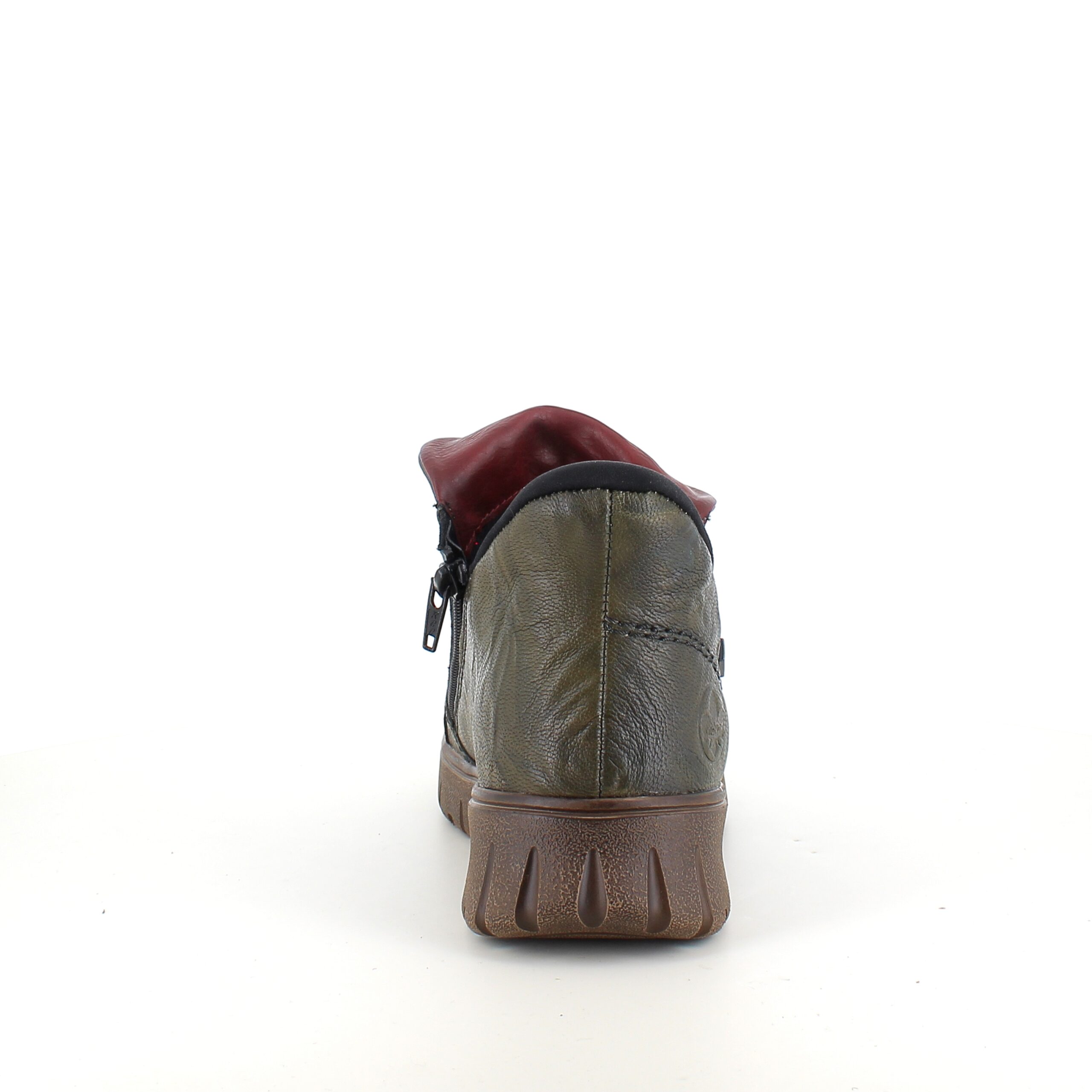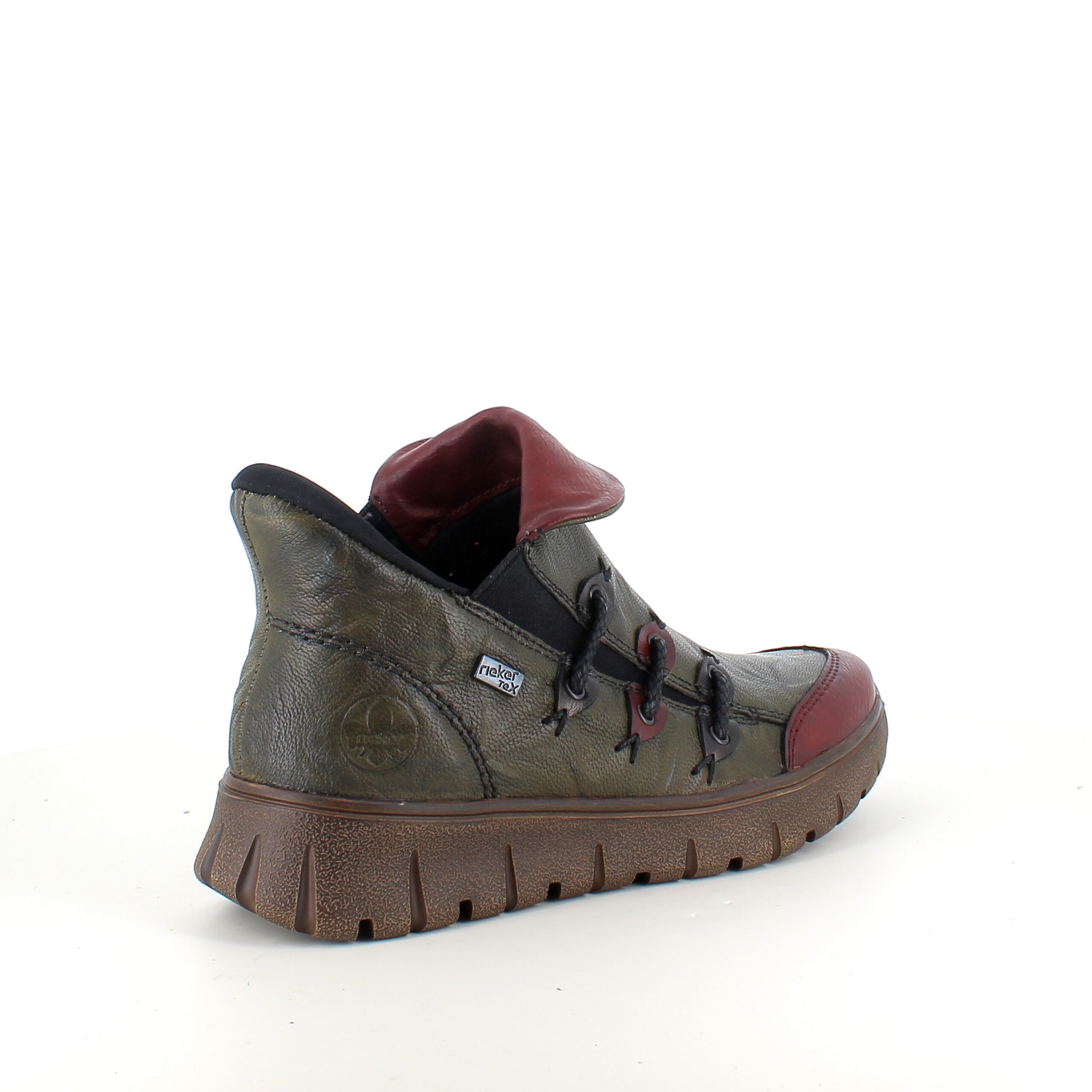 Denne smarte Rieker-støvelen er laget i en fargekombinasjon av grønn og vinrød.