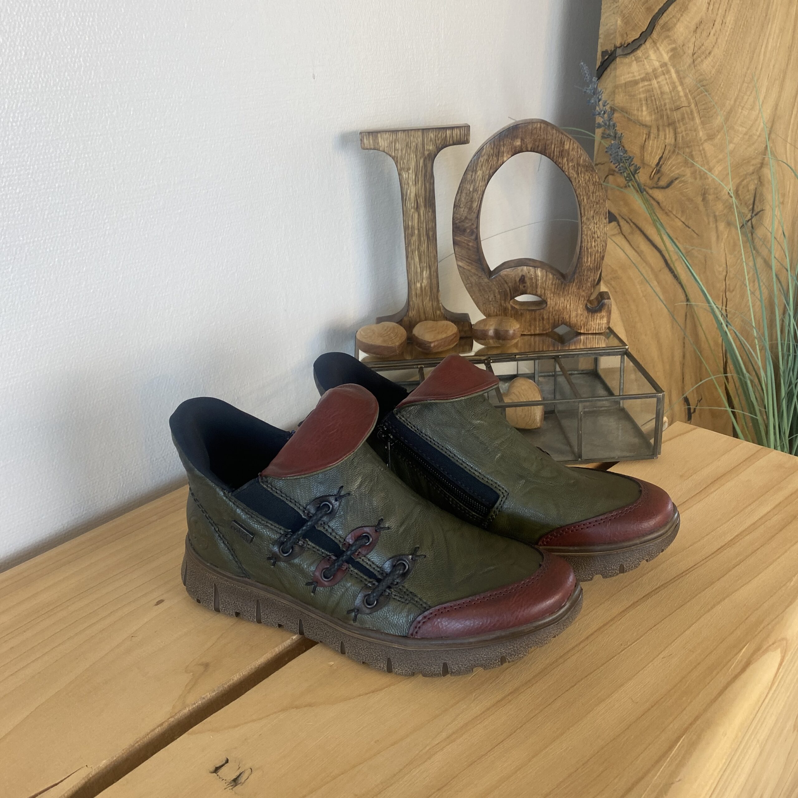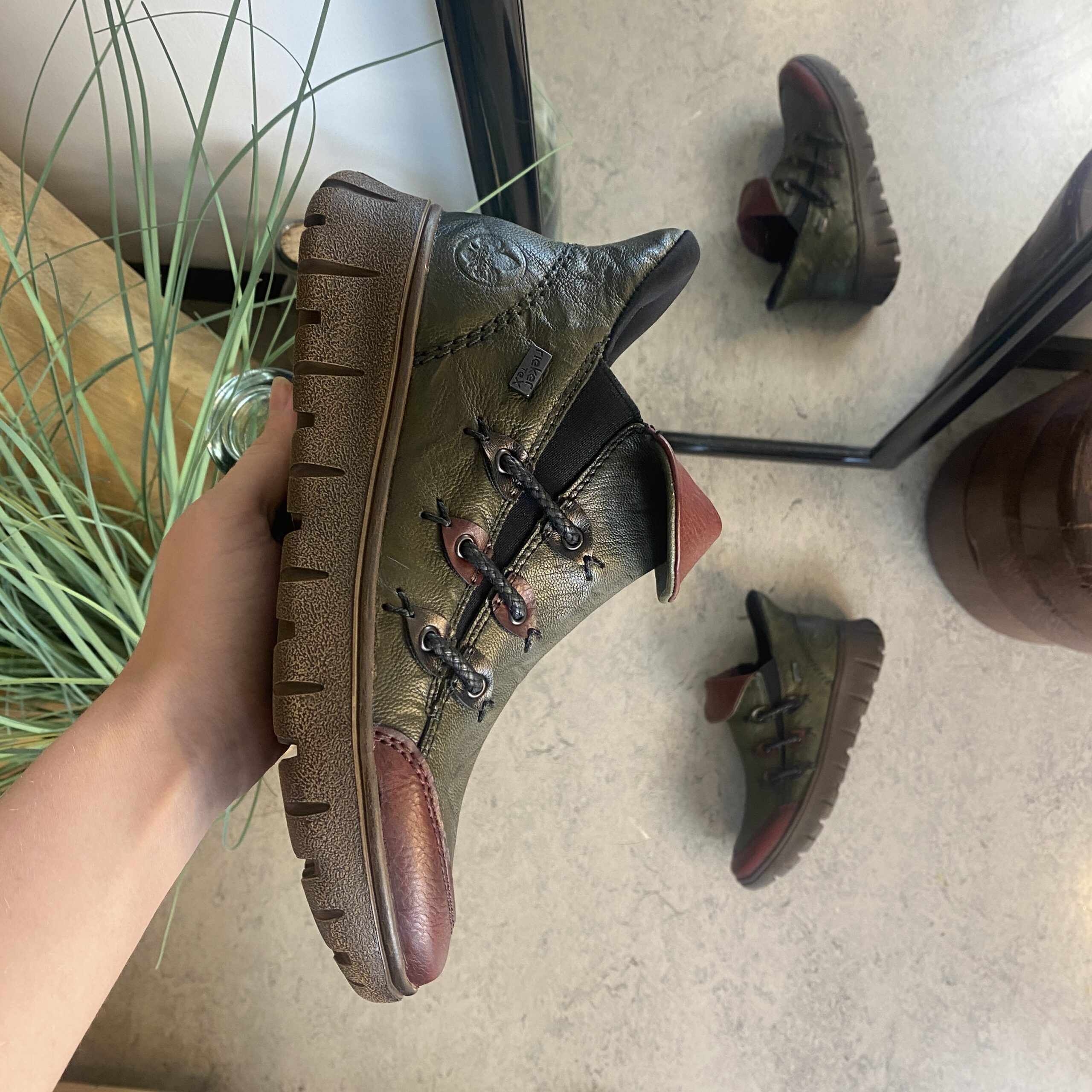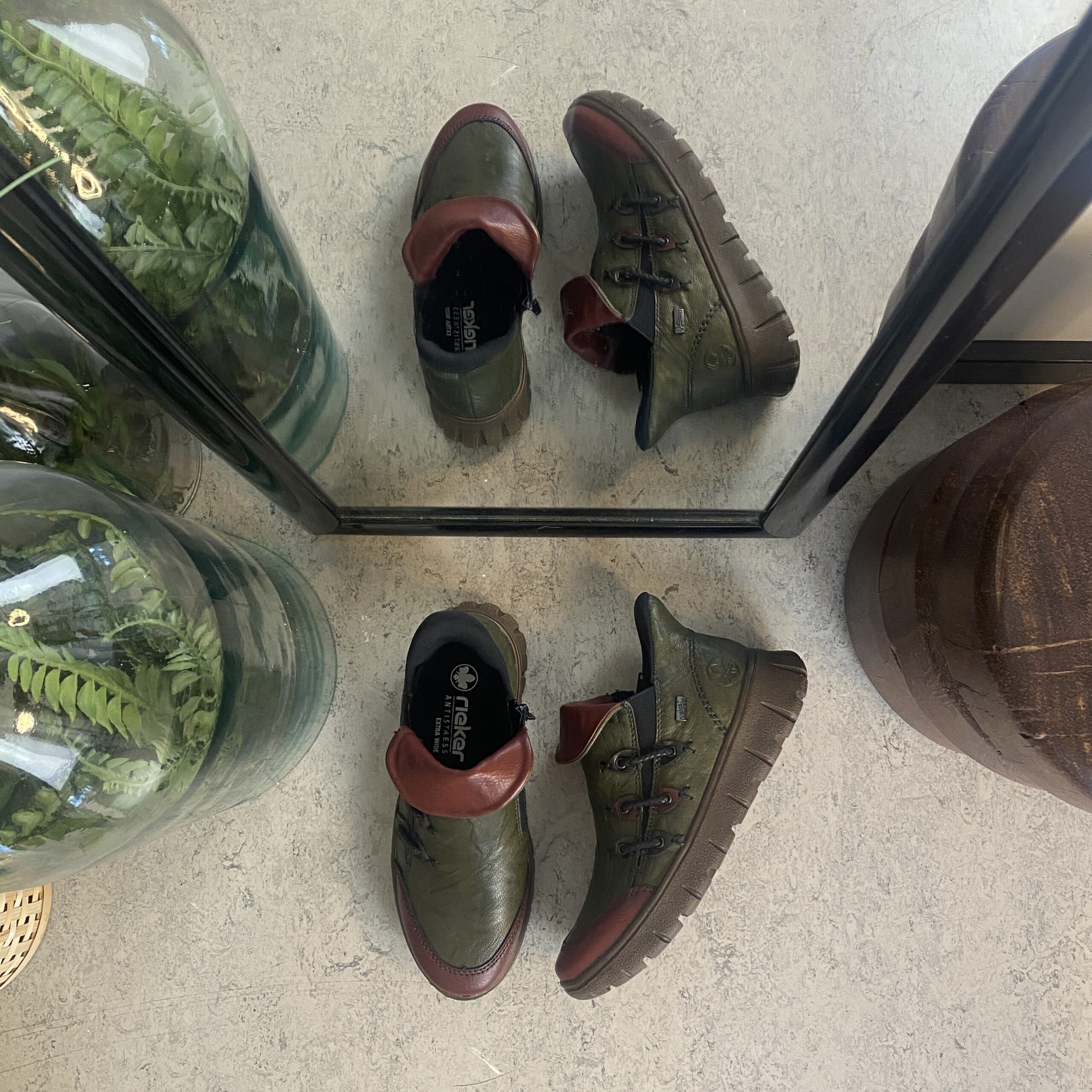 Denne smarte Rieker-støvelen er laget i en fargekombinasjon av grønn og vinrød.