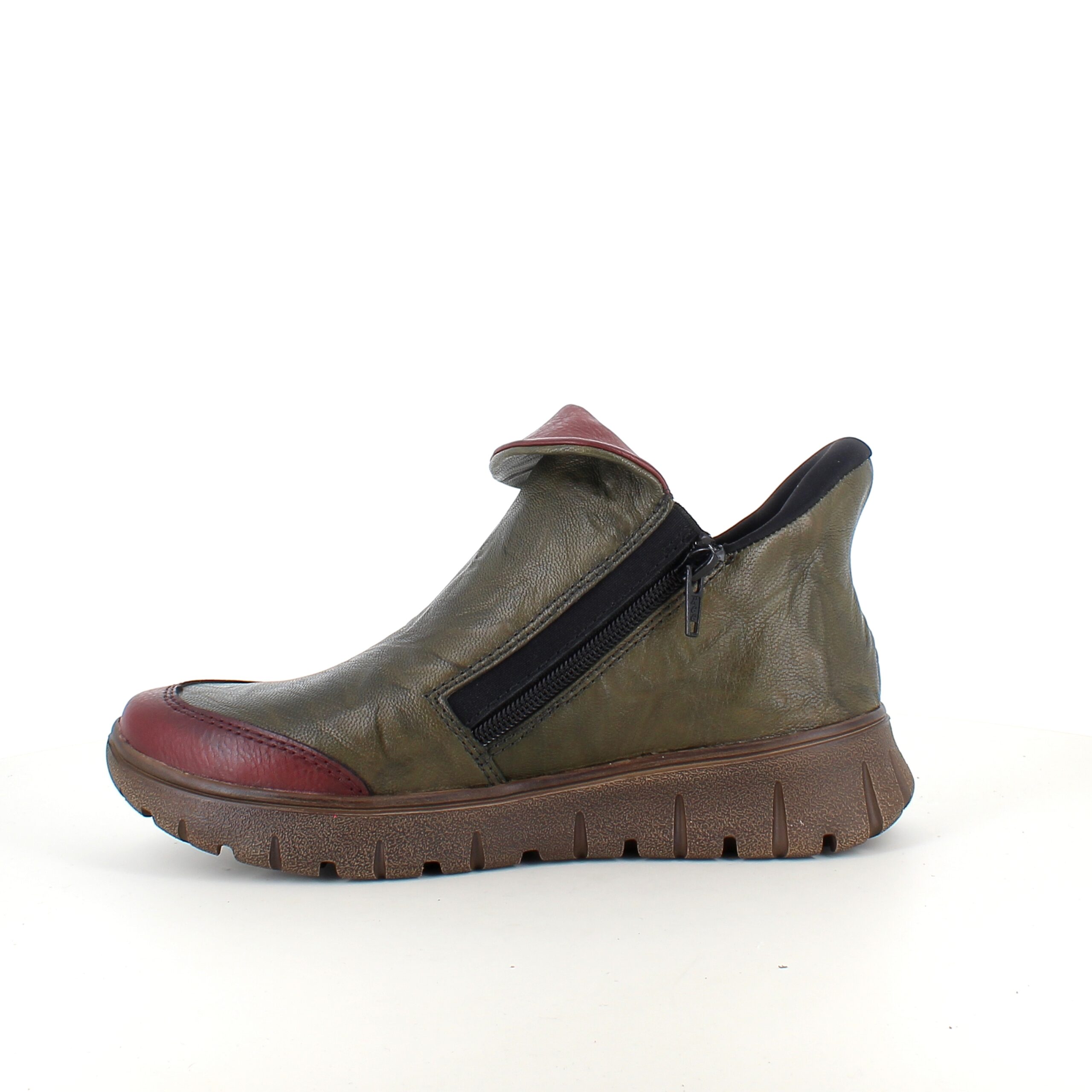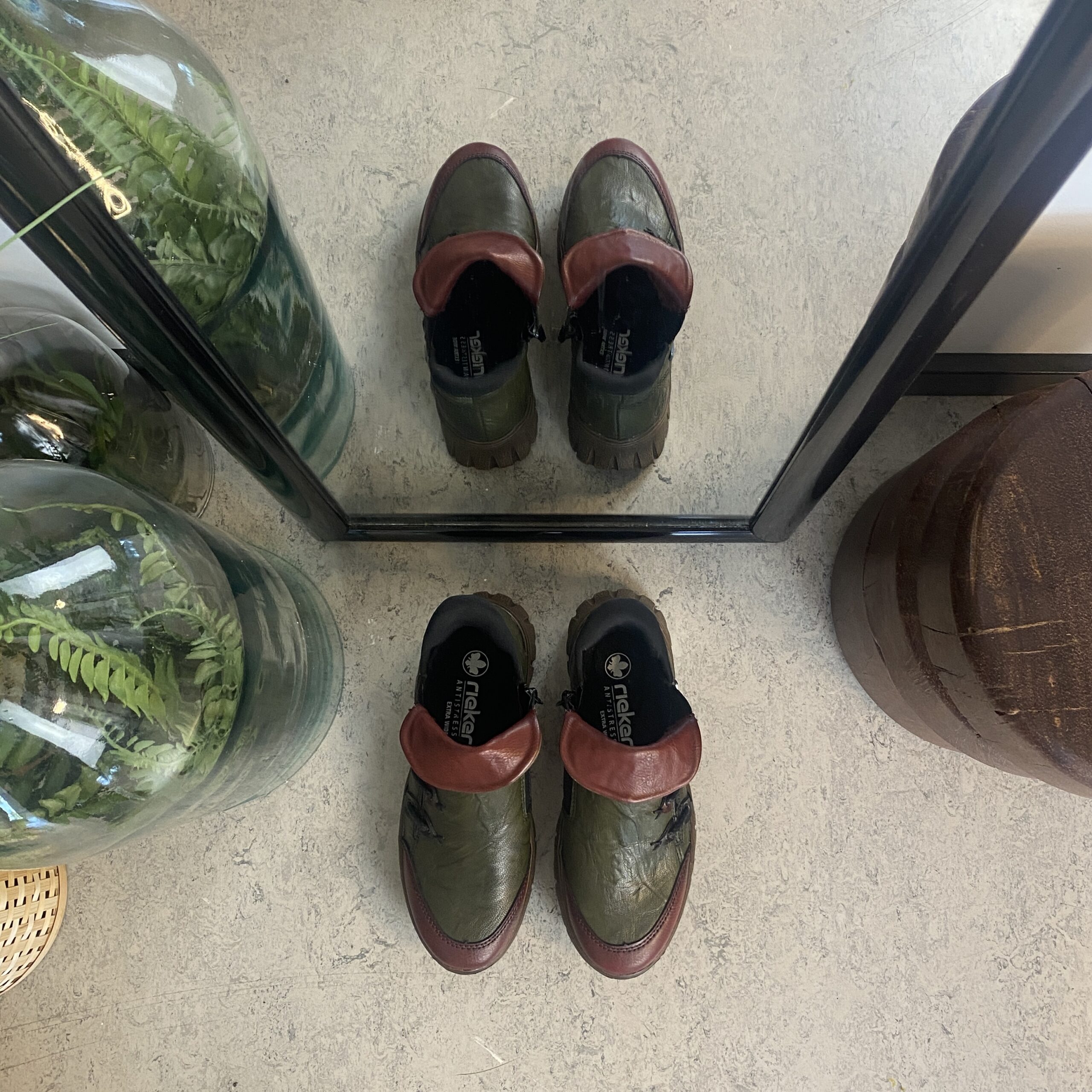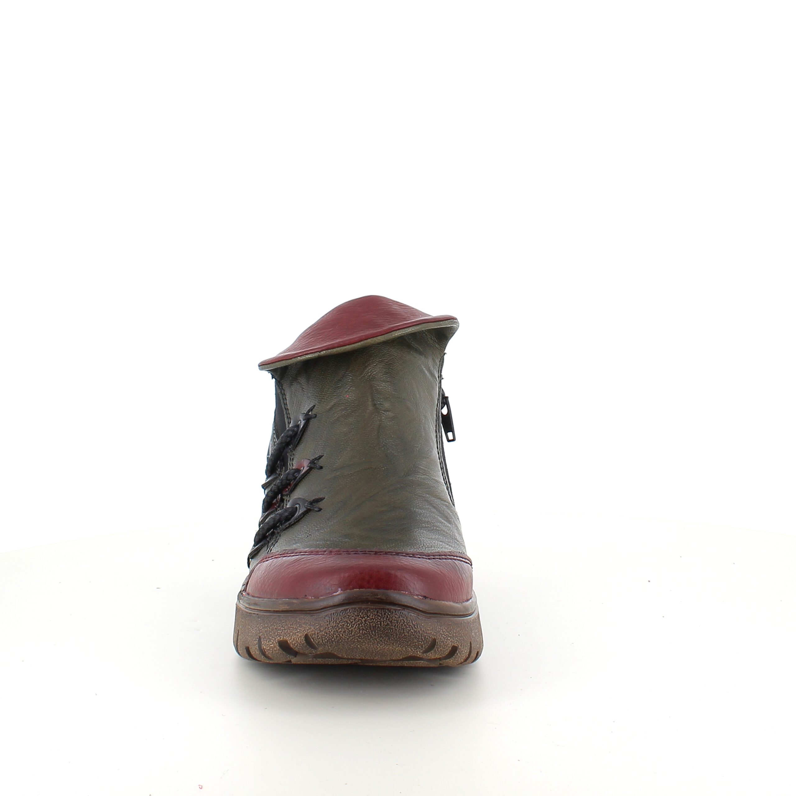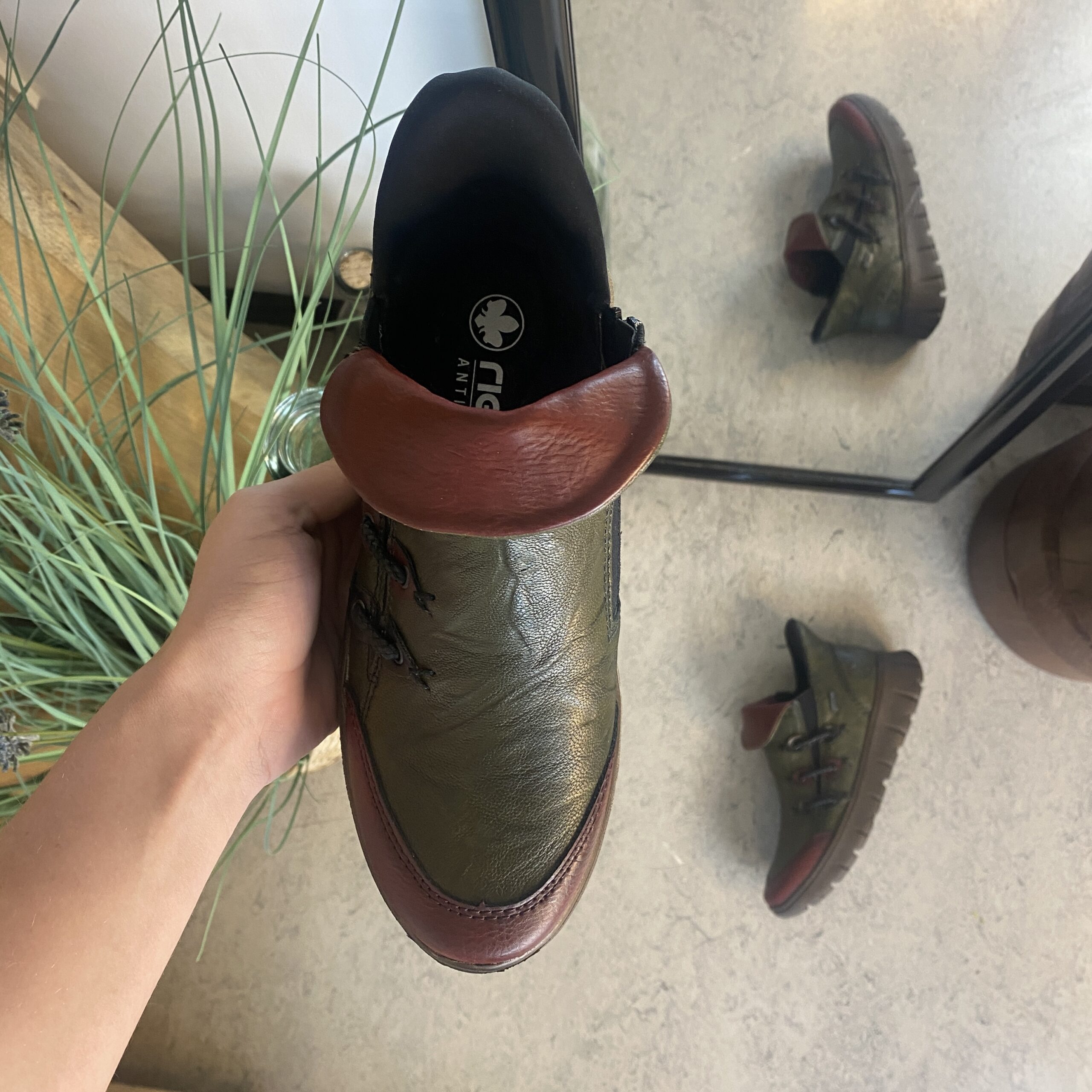 Denne smarte Rieker-støvelen er laget i en fargekombinasjon av grønn og vinrød.