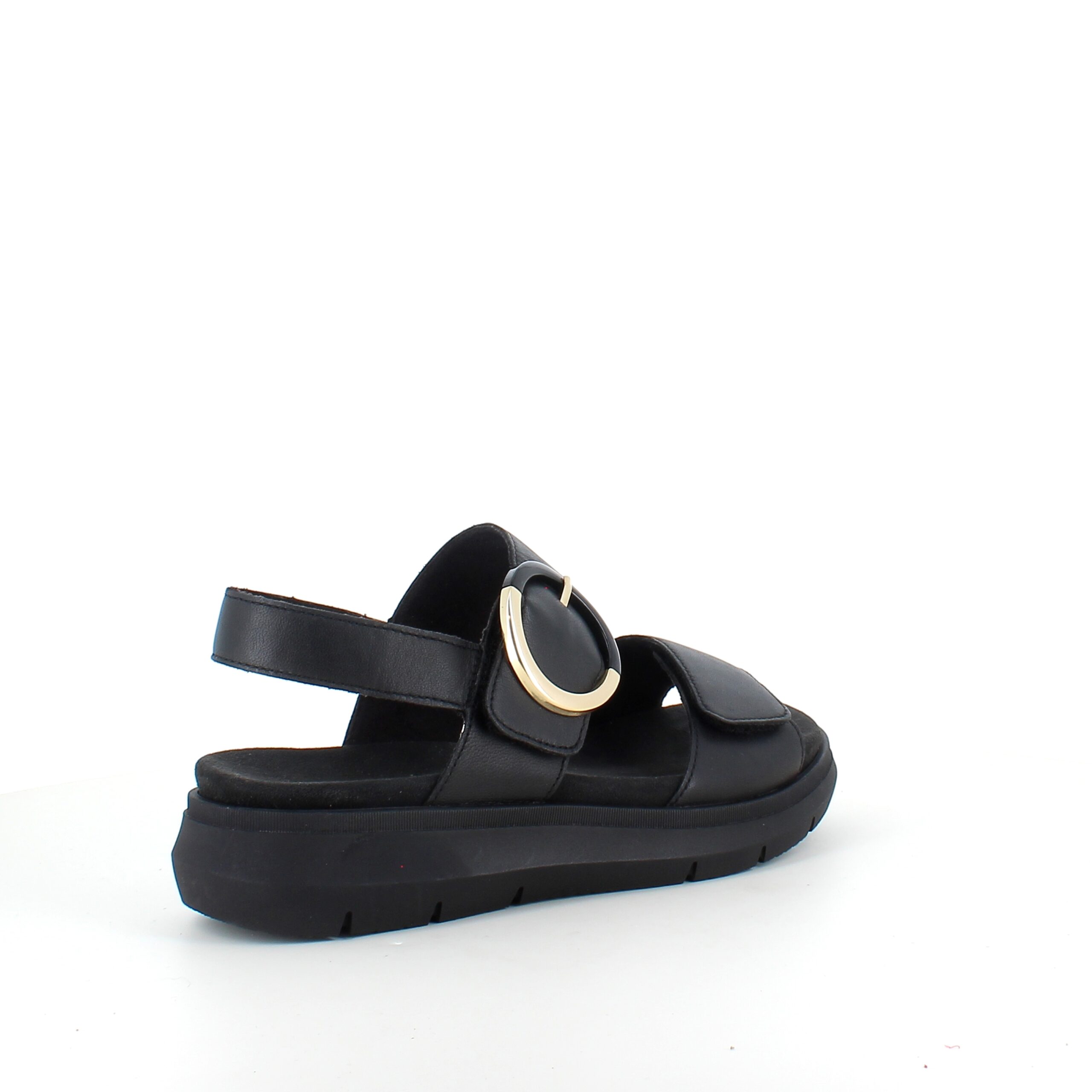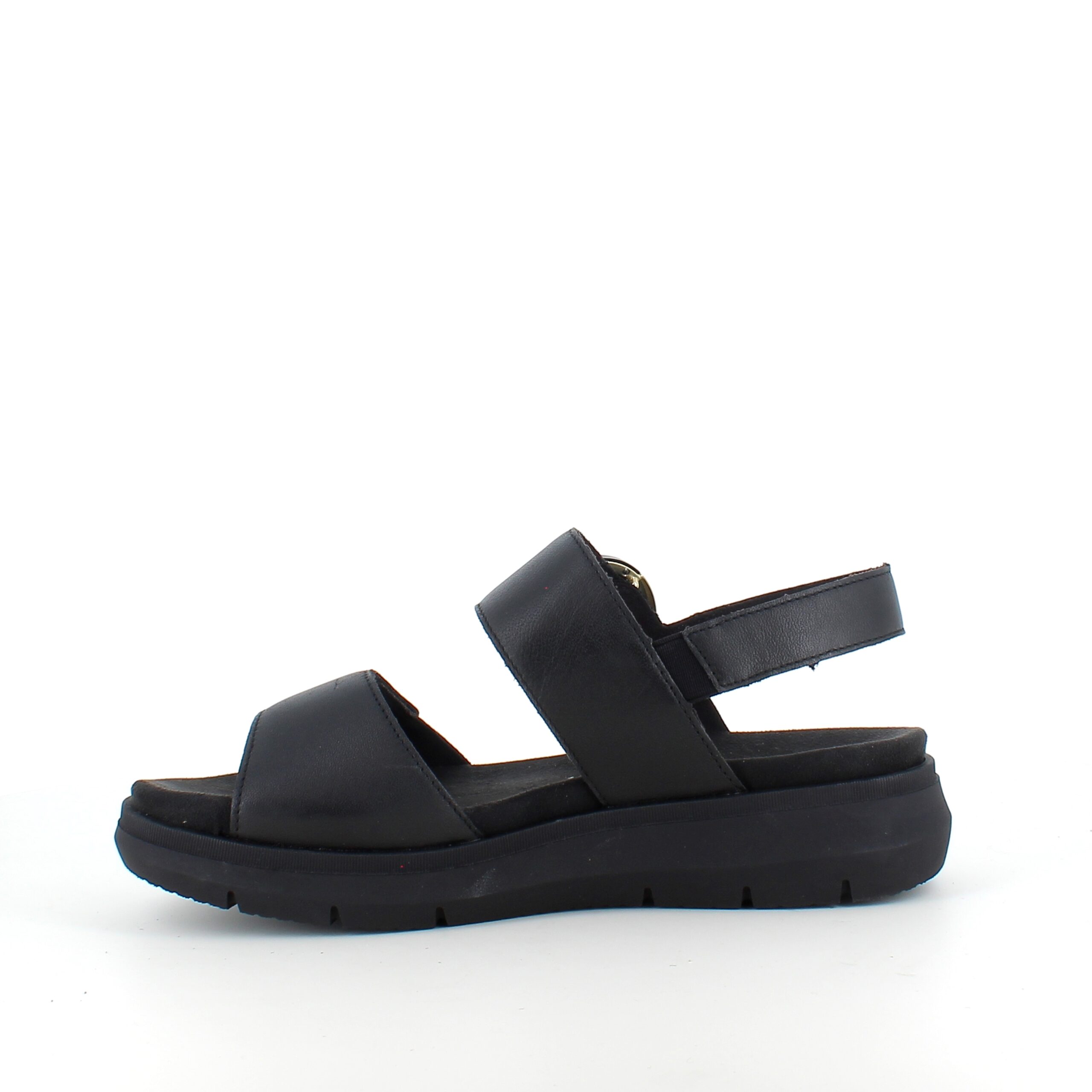 Sandalen er utført i sort glatt lær og kombinerer eleganse med praktisk design.