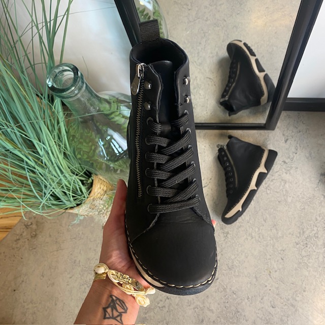 Støvelen har snørebånd og glidelås, så den er enkel å ta av og på.