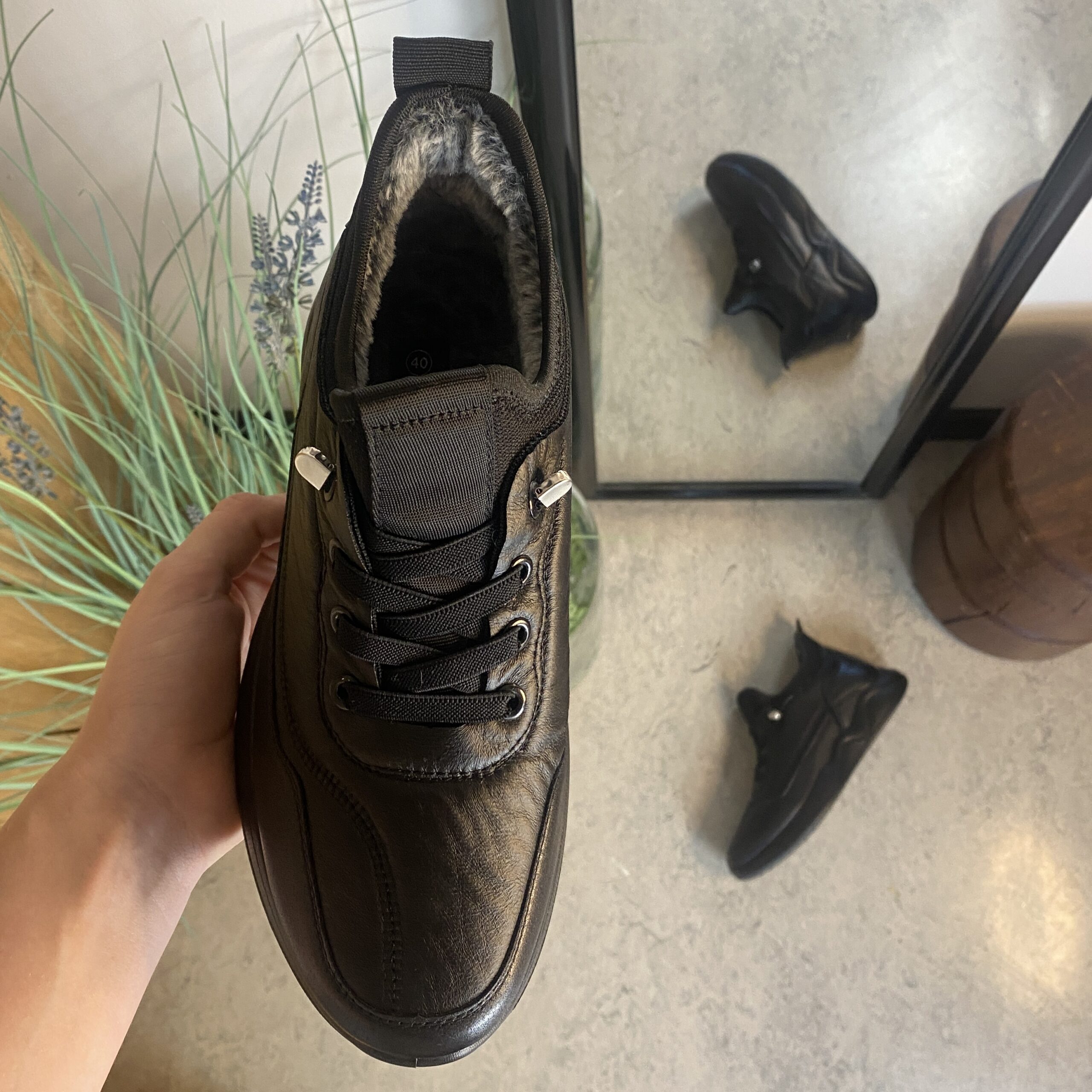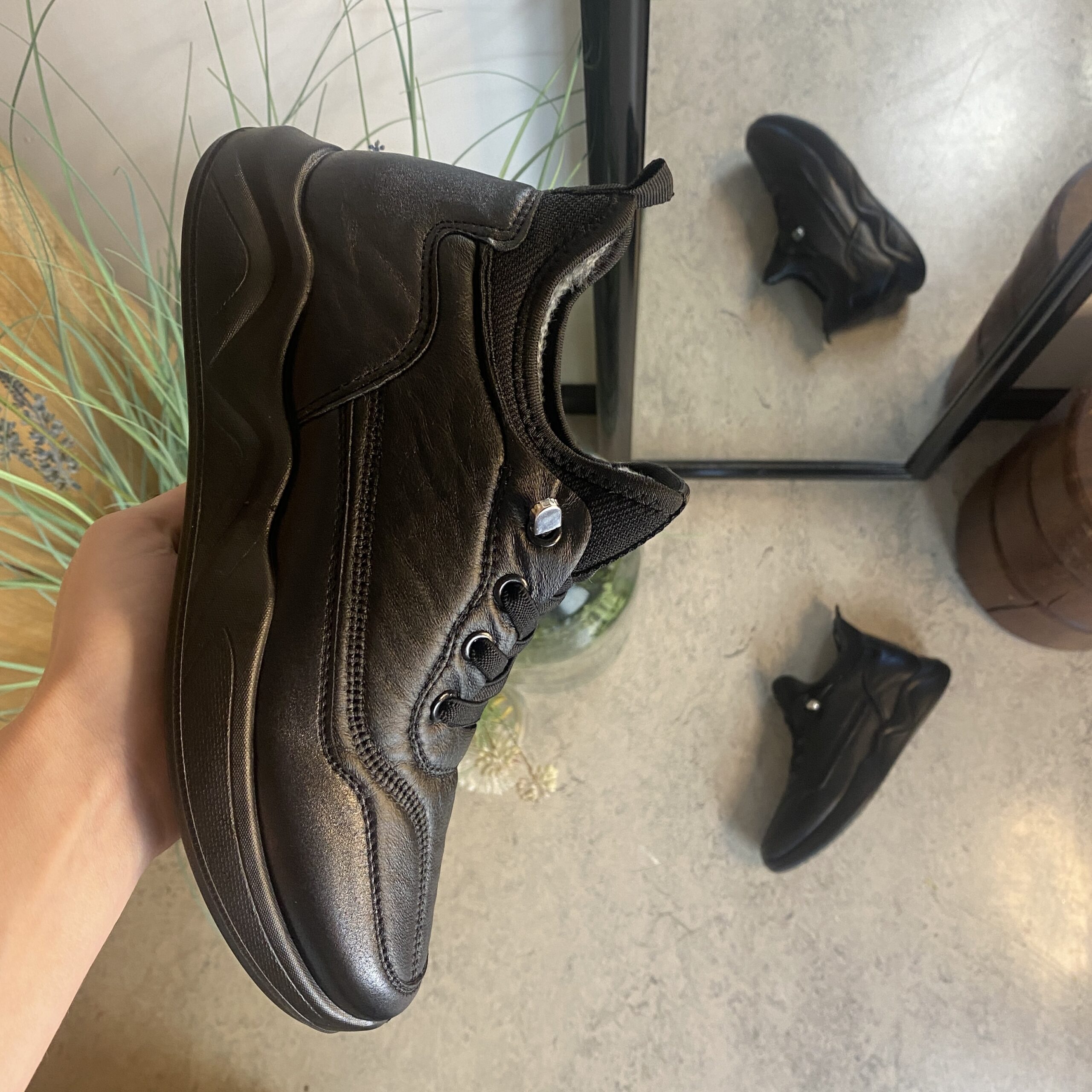 Elegante sorte herresko med fokus på komfort og bekvemmelighet.